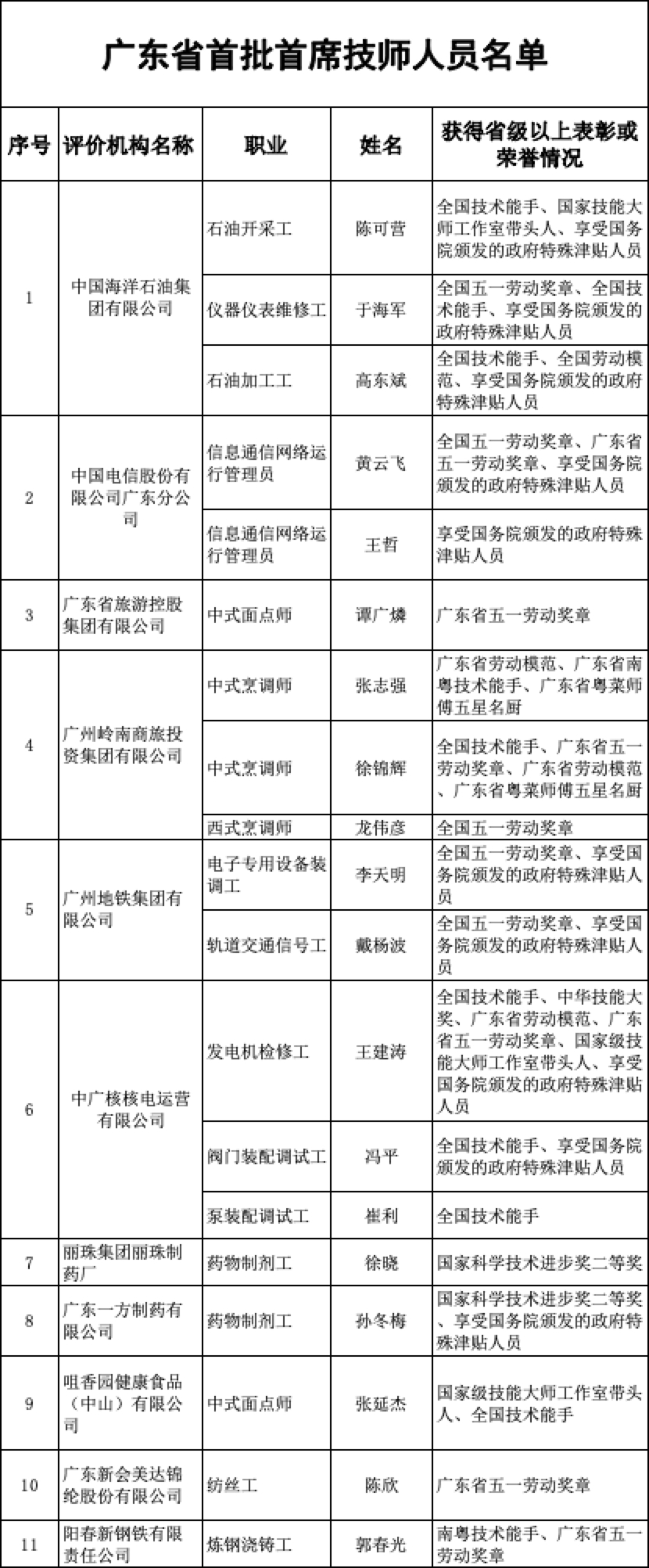 2023年12月底,经企业自主评审、地市推荐、专家统一评审、向社会公示后,广东诞生首批19名首席技师。1月4日,广东省人力资源和社会保障厅正式公布。