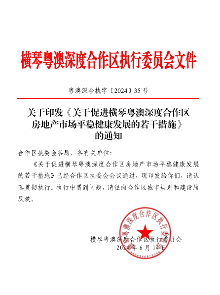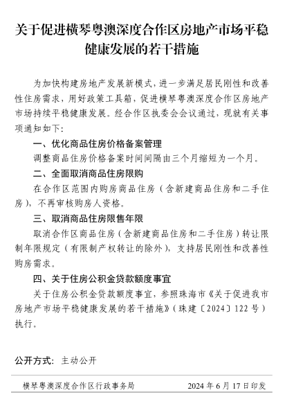 6月20日,横琴粤澳深度合作区执行委员会印发《关于促进横琴粤澳深度合作区房地产市场平稳健康发展的若干措施》的通知,在合作区范围内购买商品住房,不再审核购房人资格,同步取消商品住房限售年限。
