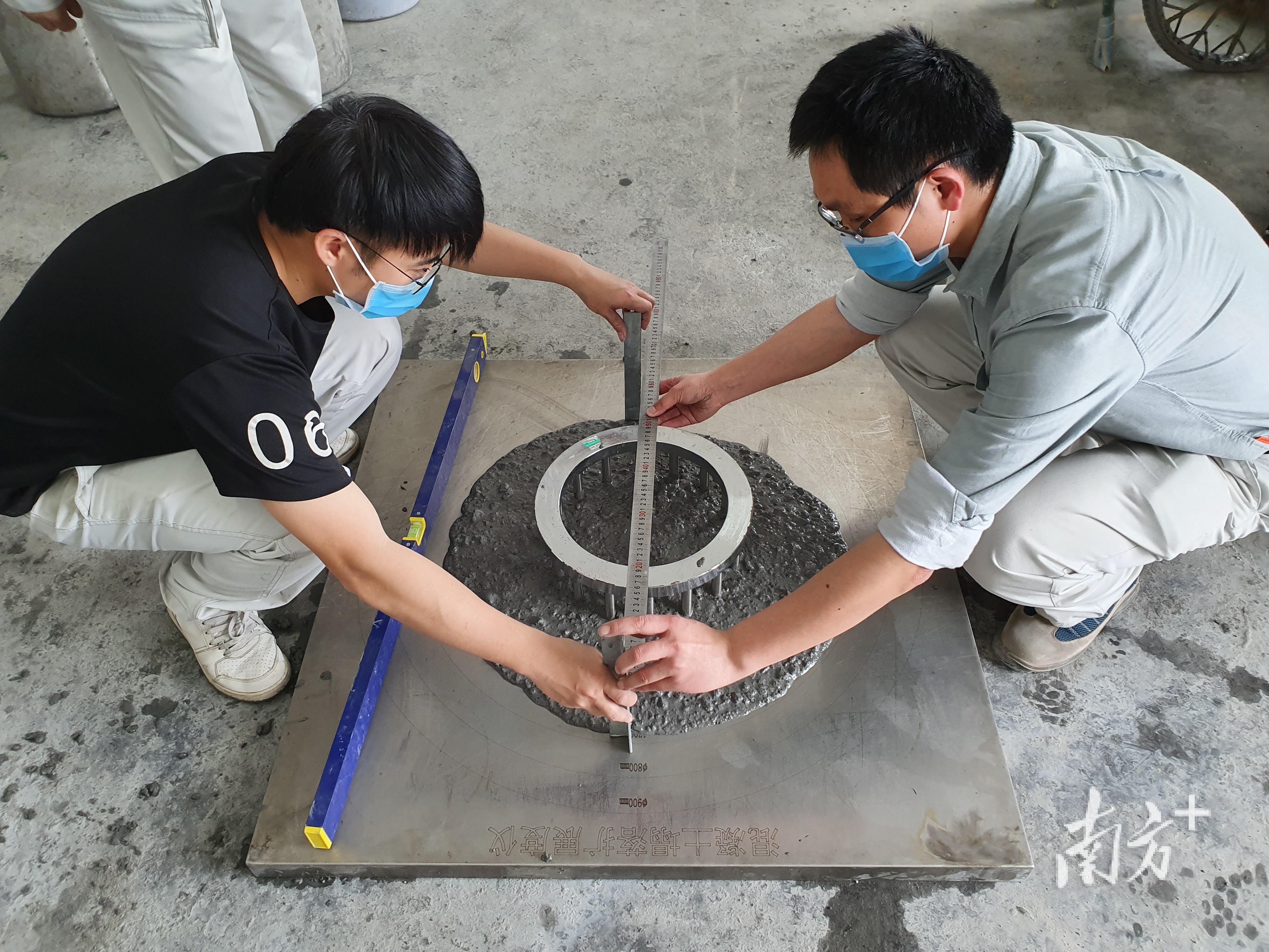 室内实验成功还远远不够,要想真正检验性能还需要开展自密实混凝土足尺模型浇筑试验。早在2016年1月,中交四航研究院科研团队就在江门新会预制场开始了深中通道自密实混凝土沉管海上足尺模型浇筑试验。“那天新会突然来了一次寒潮,最低温度达到了1℃,我们连夜订购了50套防风外套。团队每个人都冻得面红耳赤,对讲机中的声音此起彼伏,每个人各司其职,最终保证了混凝土的顺利浇筑。”邓春林回忆道。