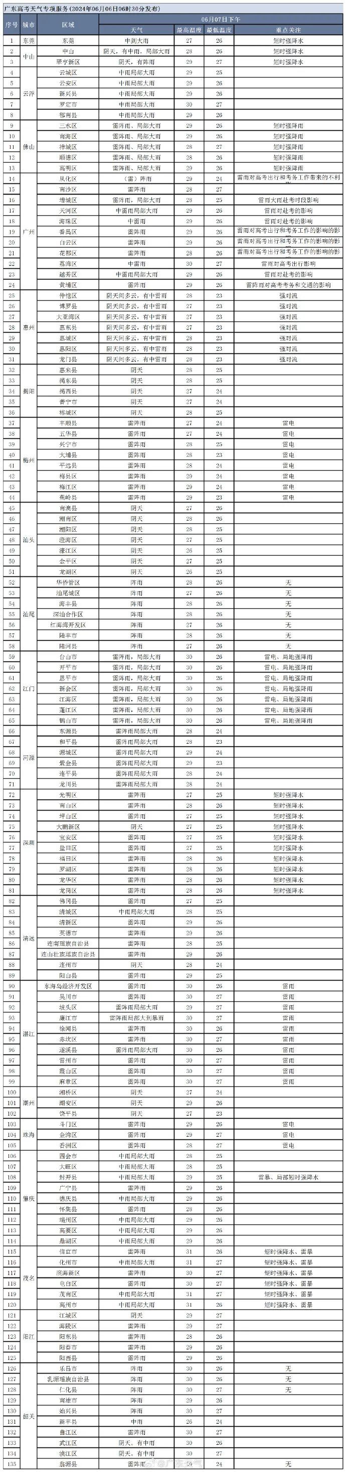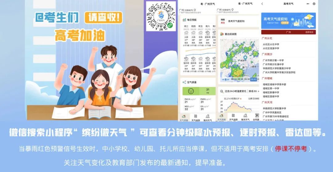 高考期间广东省多雷雨,局地雨势大,请考生注意出行安全,提前规划好赴考路线。