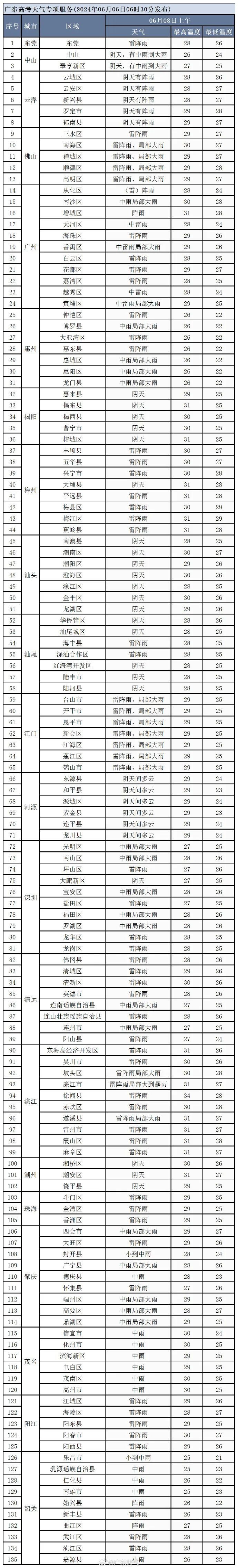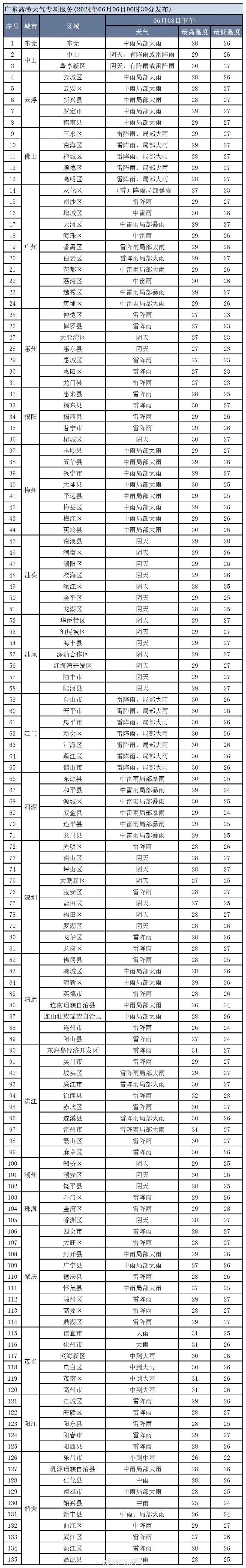 7日(高考首日),粤北多云,有阵雨;其余市县多云到阴天,有中雷雨,局部大雨或暴雨。