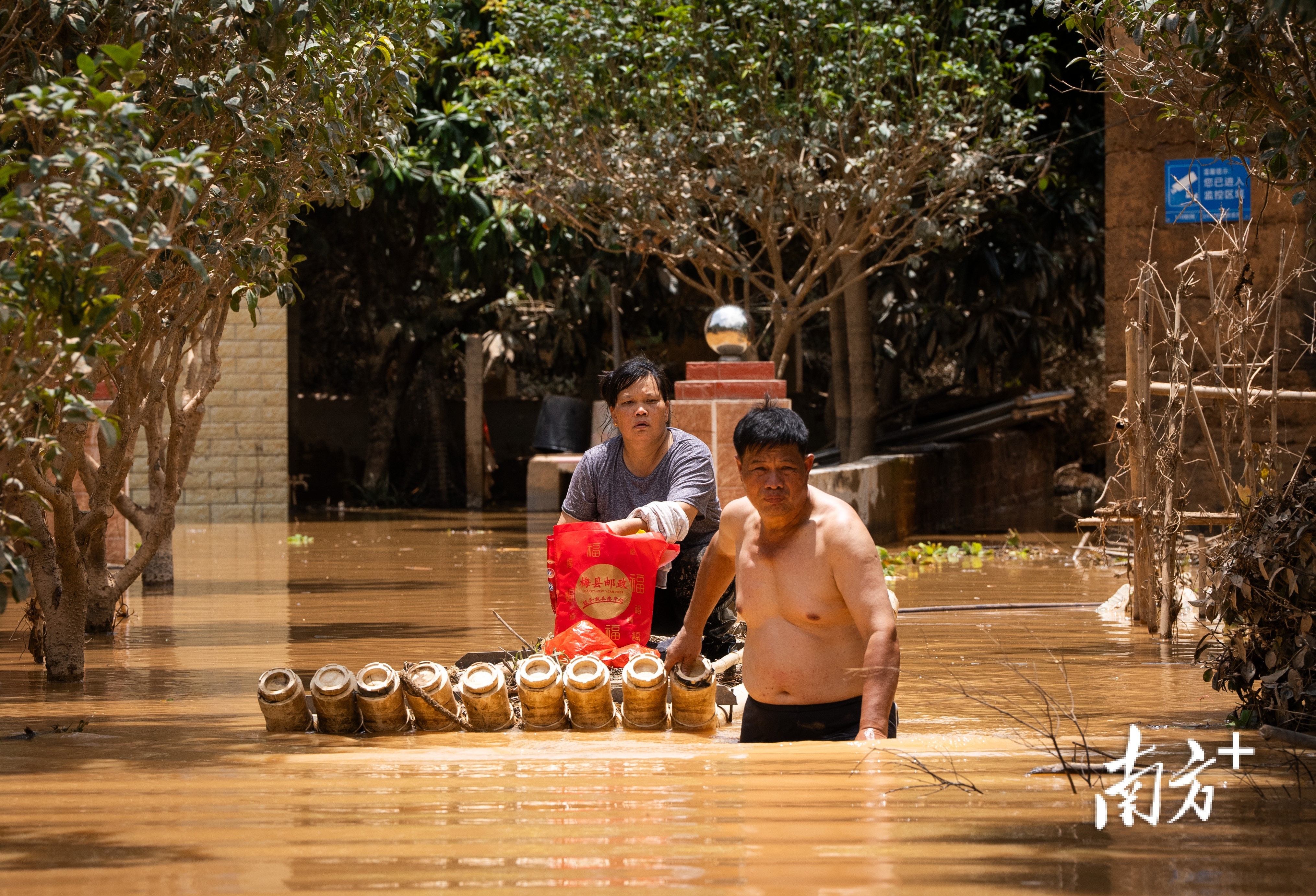 6月21日,梅州梅江,临河的村庄仍有积水,村民带着生活用品从家里转移。
