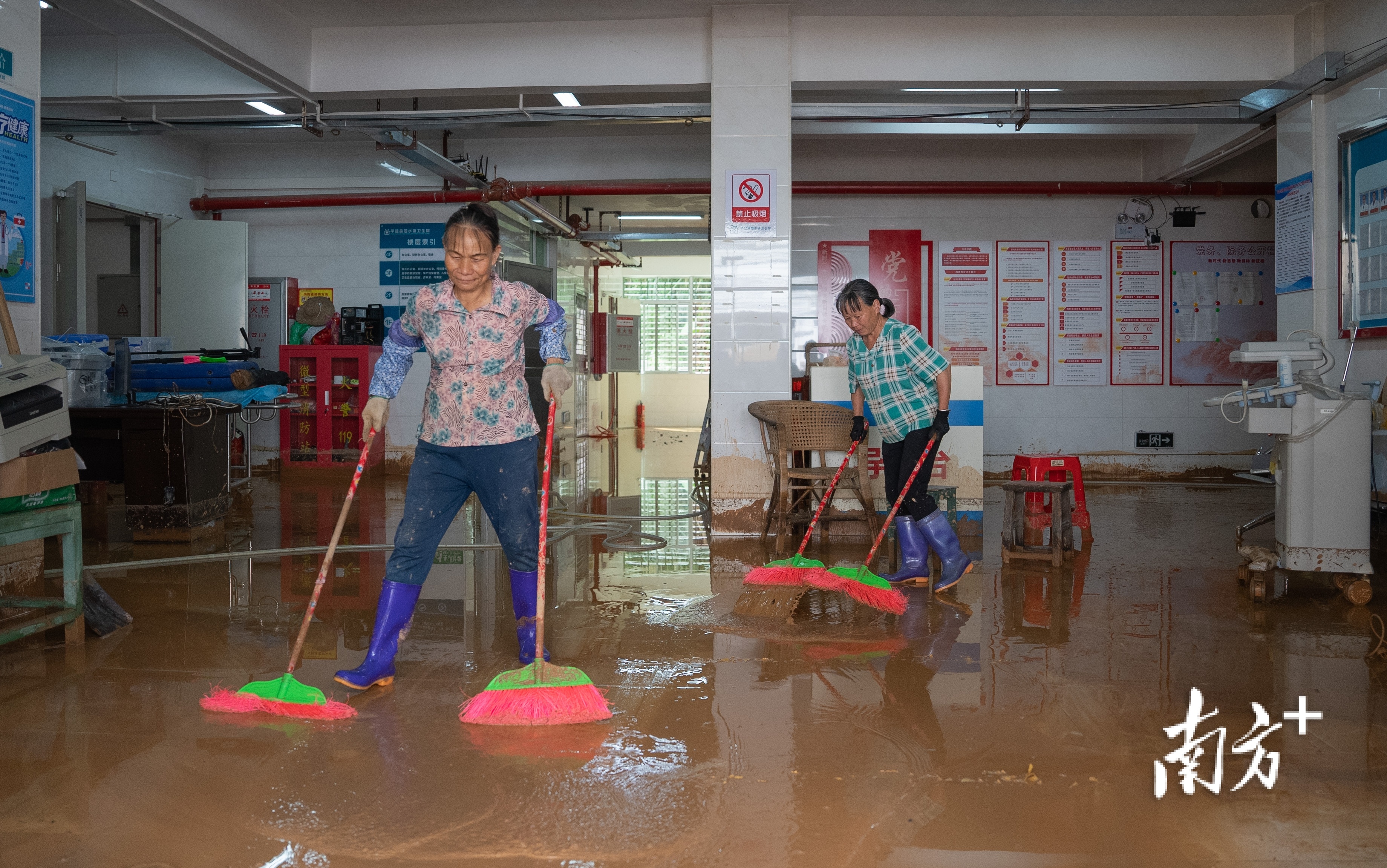 6月19日,梅州平远泗水镇卫生院内,村民帮助医院清淤。