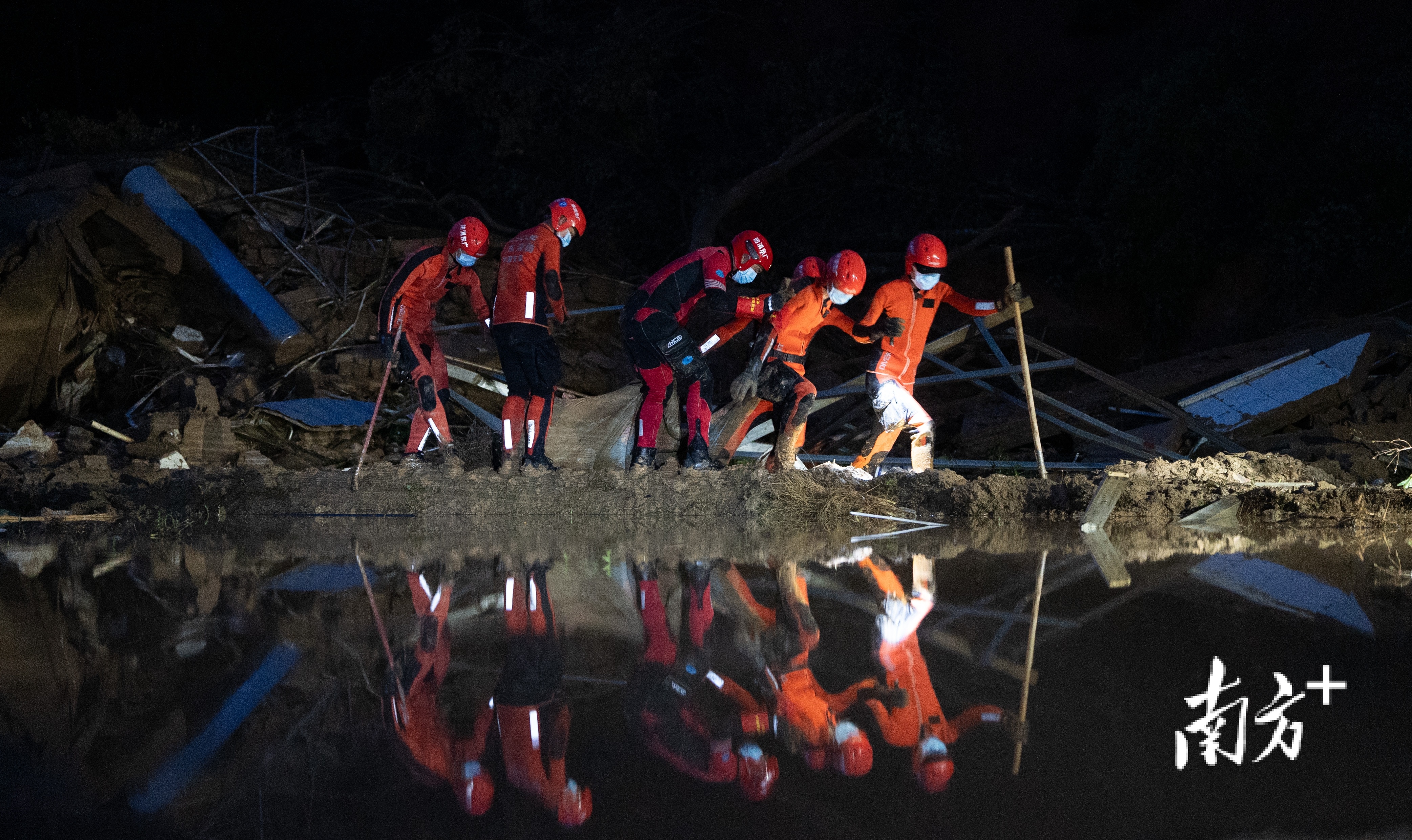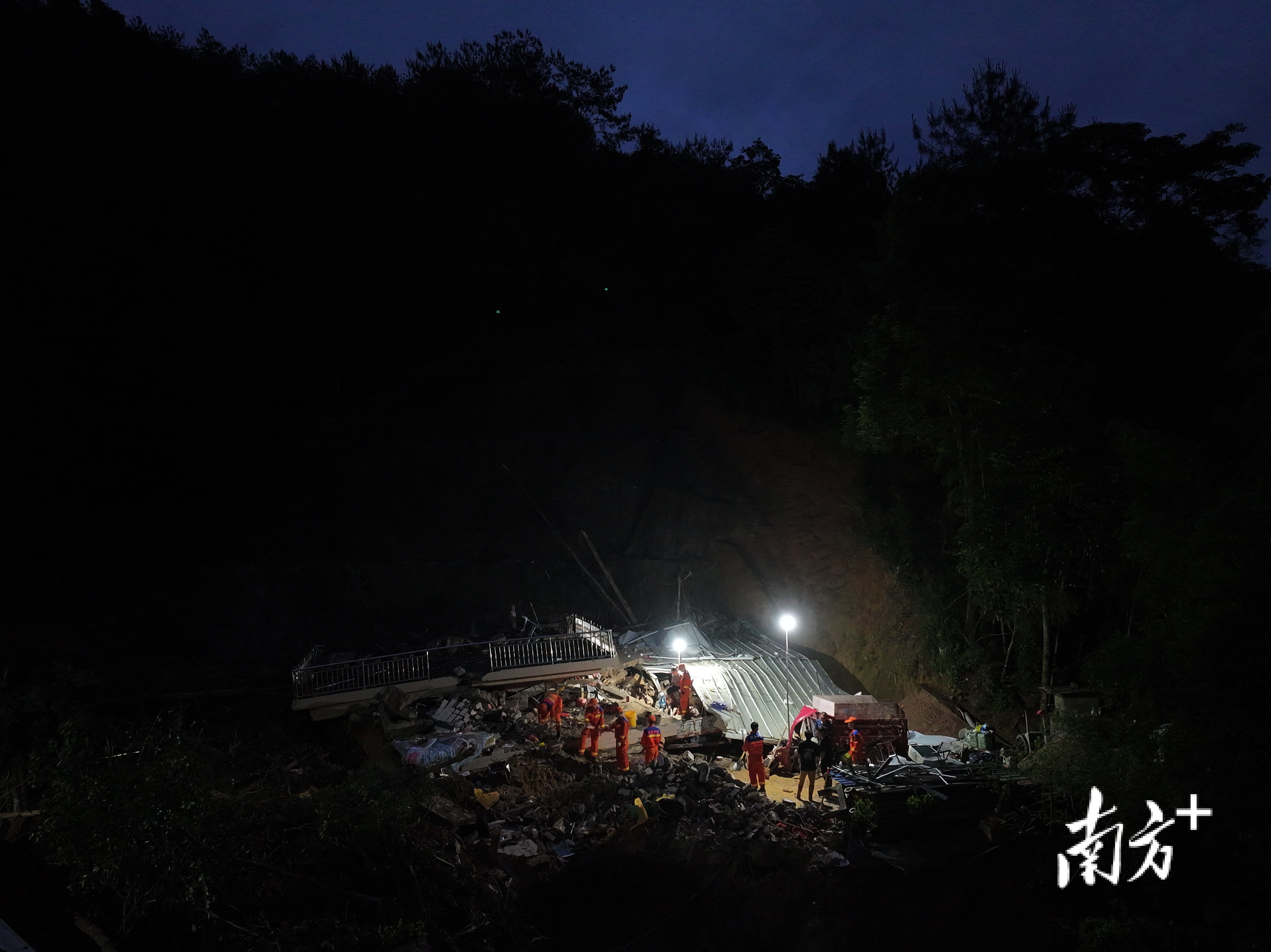 6月17日,梅州平远泗水镇大新村,救援人员趁着夜色搜索被困人员。
