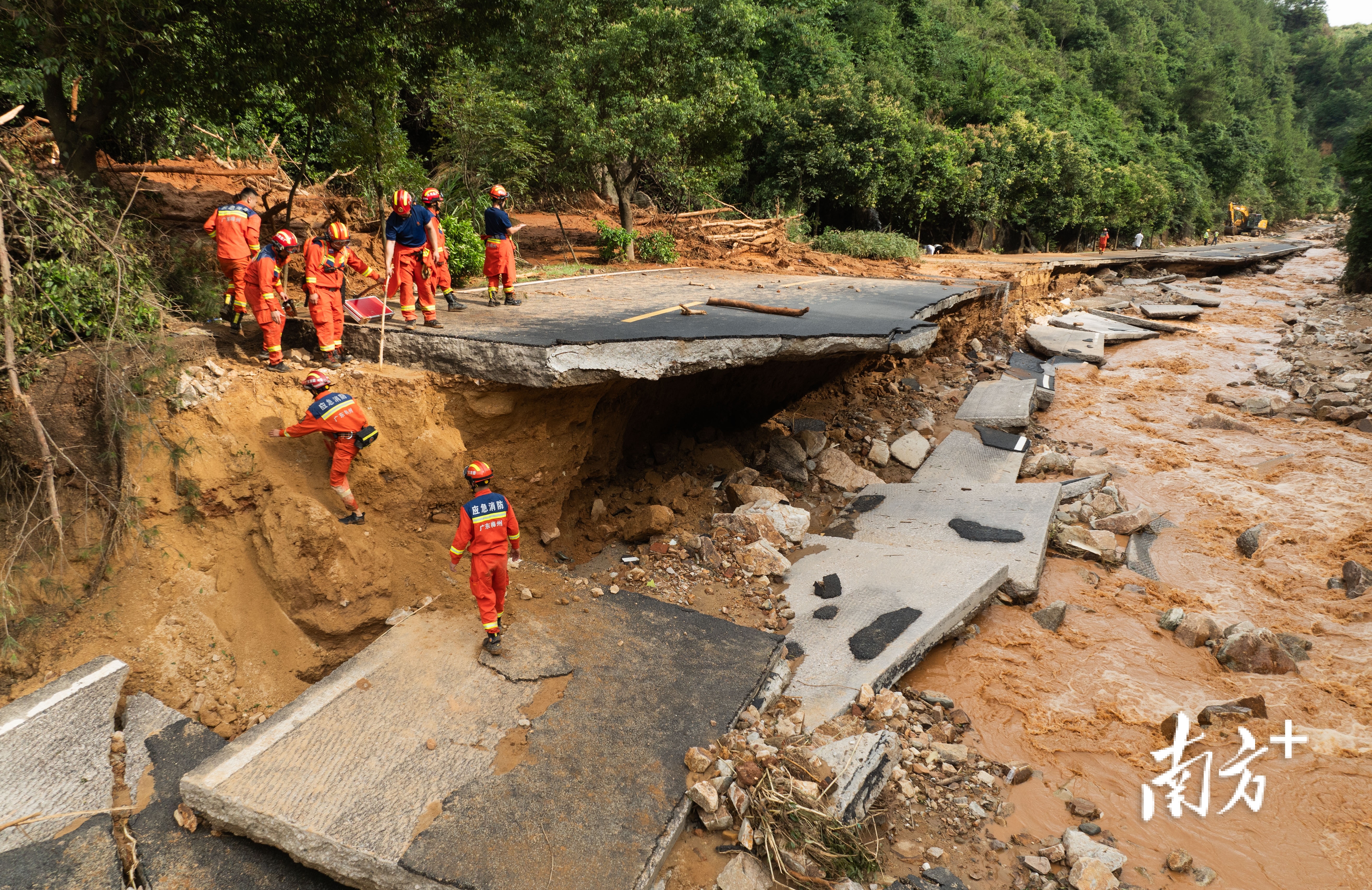 暴雨当天,梅州多地险情严峻。平远县泗水镇内的文贵村、金田村等多个村镇瞬间成了“孤岛”亟待救援;蕉岭县东北部广福镇、南磜镇的道路遭遇大面积塌方,国道坍塌达60余米,各个村庄之间不少道路也塌方,多宝村等村庄成了“孤村”。