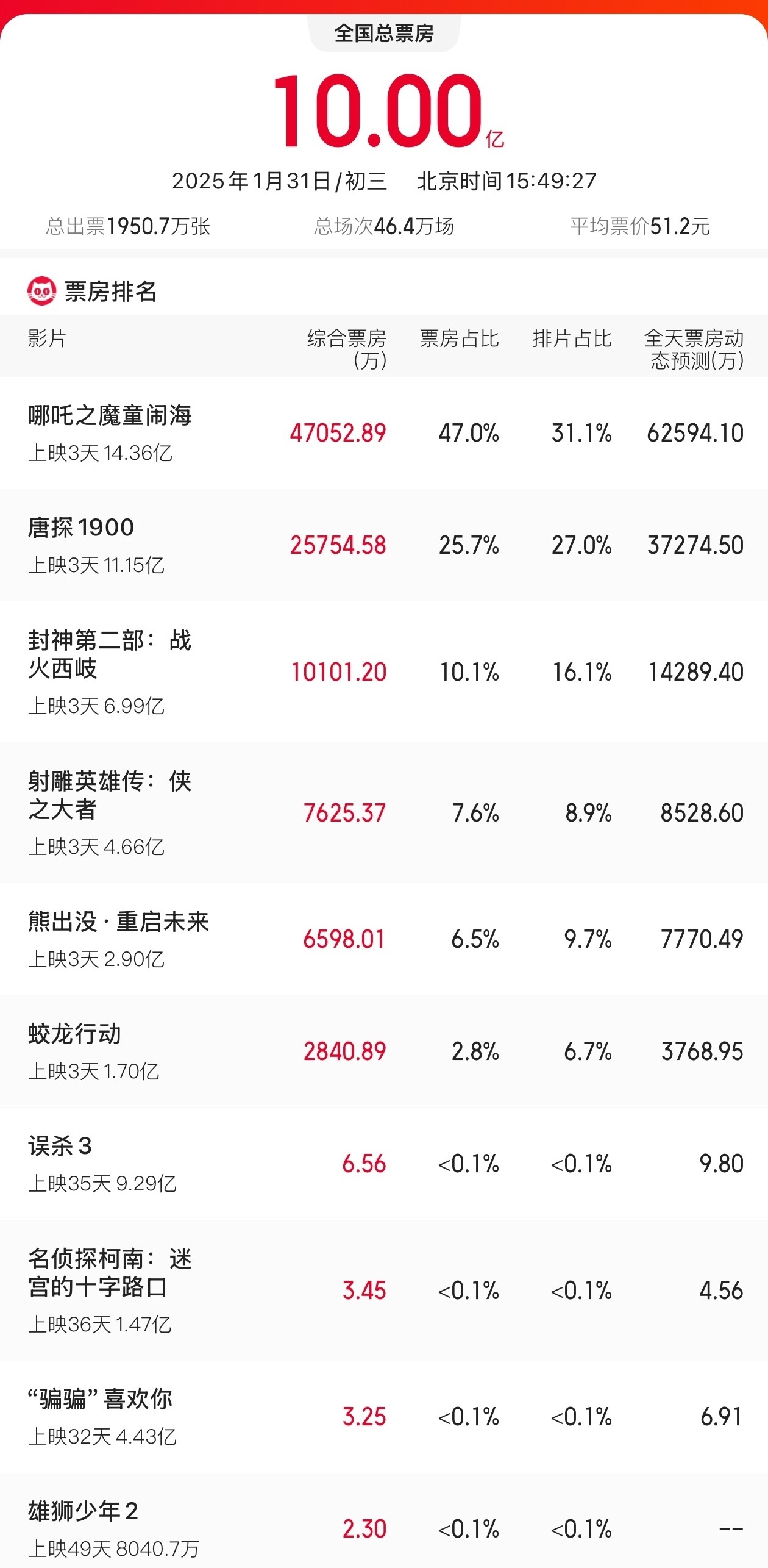 《哪吒之魔童闹海》暂列年度票房榜首位