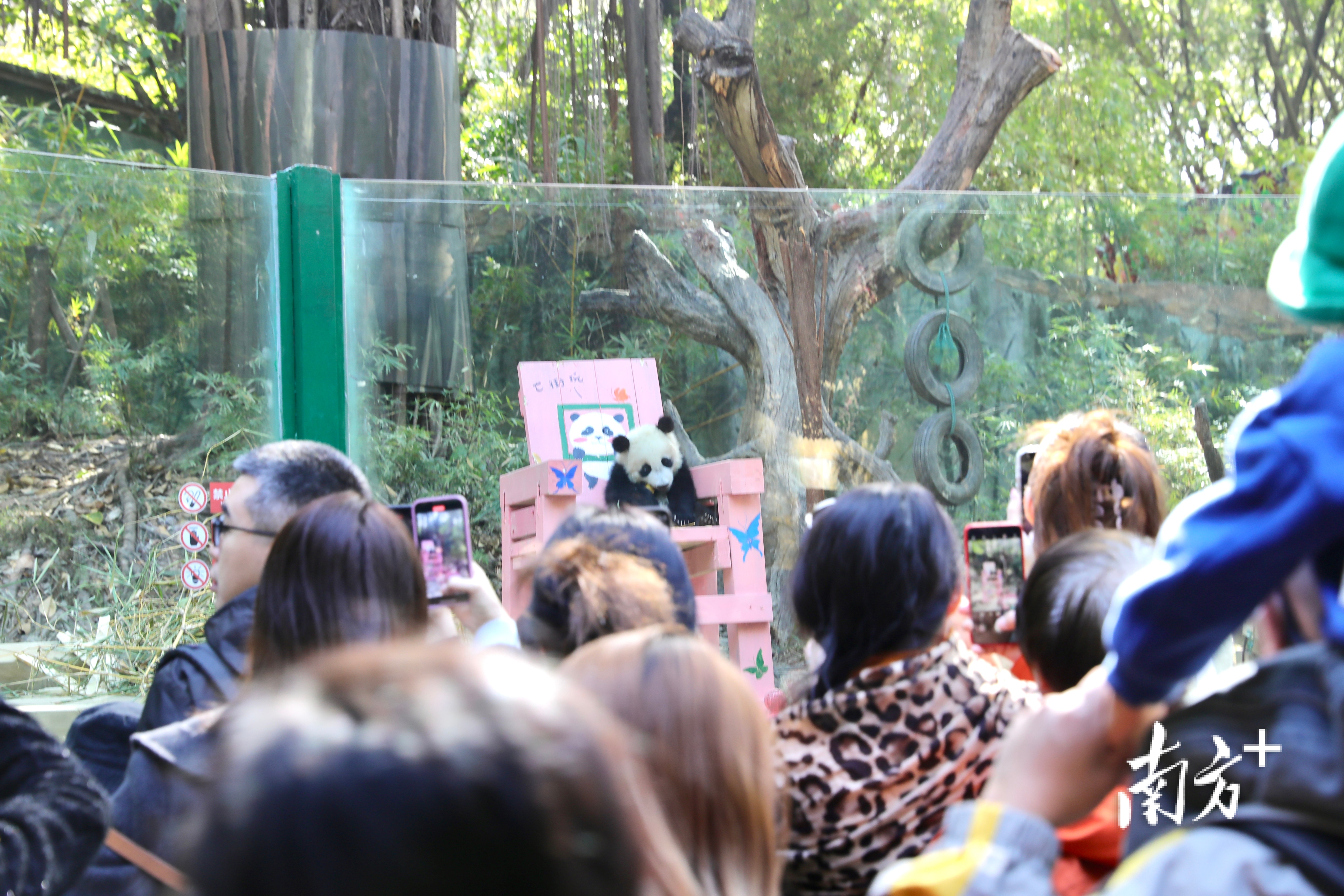 “刚刚看到‘妹猪’啦!它在树上睡觉,被保育员给抱下来放在椅子上,在椅子上吃东西。”在园区内,有一家三口刚从熊猫展区出来,女主人兴奋地告诉南方+记者,一家人都很高兴,孩子非常喜欢熊猫。
