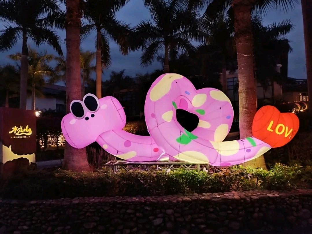 园区设置了“爱心蛇”和“舞狮蛇”主题气模,供游客打卡留念。