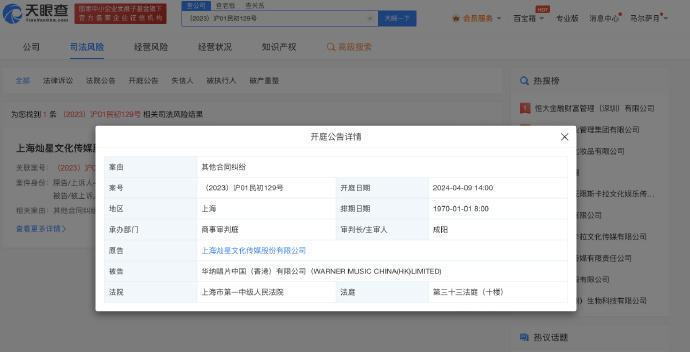 天眼查App显示,近日,《中国好声音》节目制作方上海灿星文化传媒股份有限公司新增一则开庭公告信息,被告为华纳唱片中国(香港)有限公司(WARNER MUSIC CHINA(HK)LIMITED),案由为其他合同纠纷,案件将于2024年4月9日在上海市第一中级人民法院开庭审理。目前,该案具体案由尚不清楚。
