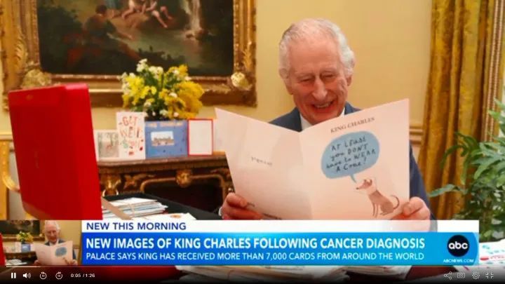 癌症晚期治疗中的国王查理三世,虽然不能参加公开活动,但还是会被拍到与政要的会面工作,最近的官方照片是他收到了来自世界各地的祝福卡很开心的样子。