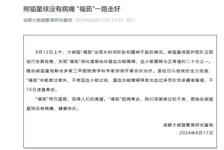 据成都大熊猫繁育研究基地消息,8月12日上午,大熊猫“福茹”出现长时间趴卧和精神不振的情况。熊猫基地医护团队立即进行全面检查,发现“福茹”消化道感染伴凝血功能障碍,血小板骤降为正常值的二十分之一。随后熊猫基地联合多家三甲医院跨学科专家持续开展会诊治疗。虽经日以继夜的全力抢救,“福茹”未能渡过难关,不幸因血小板过低、凝血功能障碍导致出血过多而引发多器官衰竭,于16日凌晨离世。
