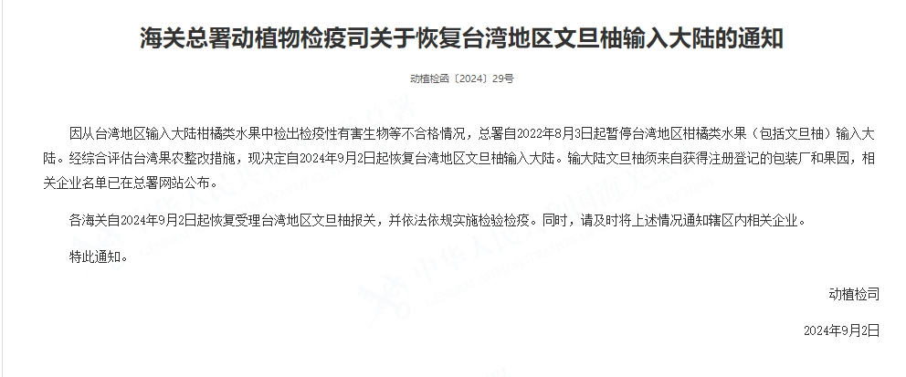 据海关总署网站消息,因从台湾地区输入大陆柑橘类水果中检出检疫性有害生物等不合格情况,总署自2022年8月3日起暂停台湾地区柑橘类水果(包括文旦柚)输入大陆。经综合评估台湾果农整改措施,现决定自2024年9月2日起恢复台湾地区文旦柚输入大陆。输大陆文旦柚须来自获得注册登记的包装厂和果园,相关企业名单已在总署网站公布。