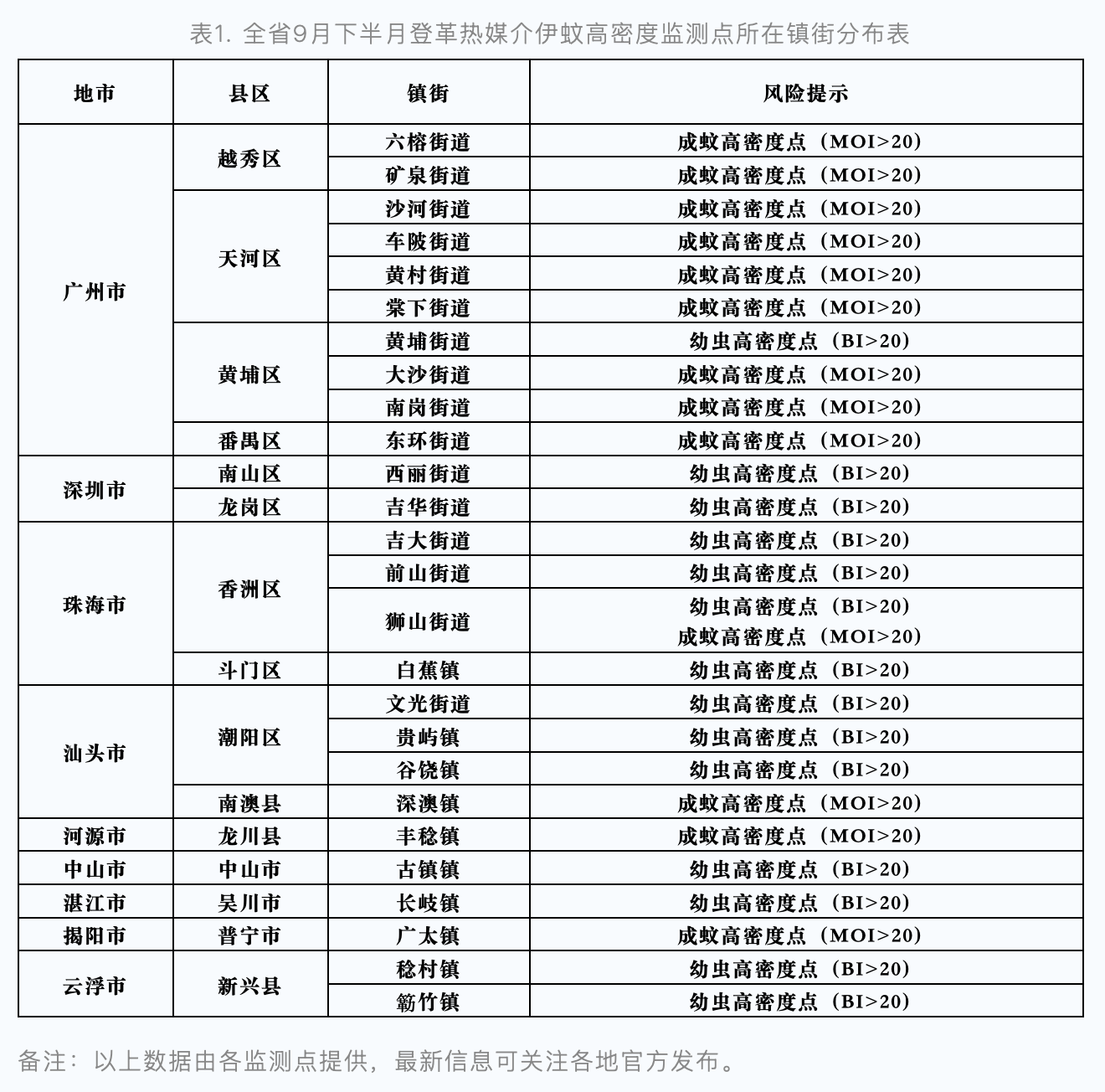 10月8日,广东疾控公布了9月下半月登革热媒介伊蚊监测风险提示,也就是“蚊子地图”,所处地区的媒介伊蚊密度越高,发生登革热流行的风险越高。