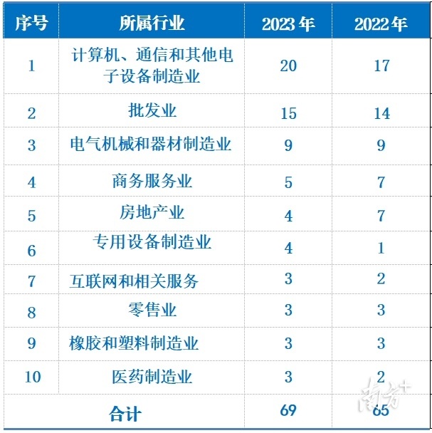 南方+记者从公布的榜单和信息中获悉,2024广东民营企业 100 强企业涉及30多个细分行业,其中 69家集中分布在十个二级大类行业,涉及企业相比上一年的65家增加了4家。