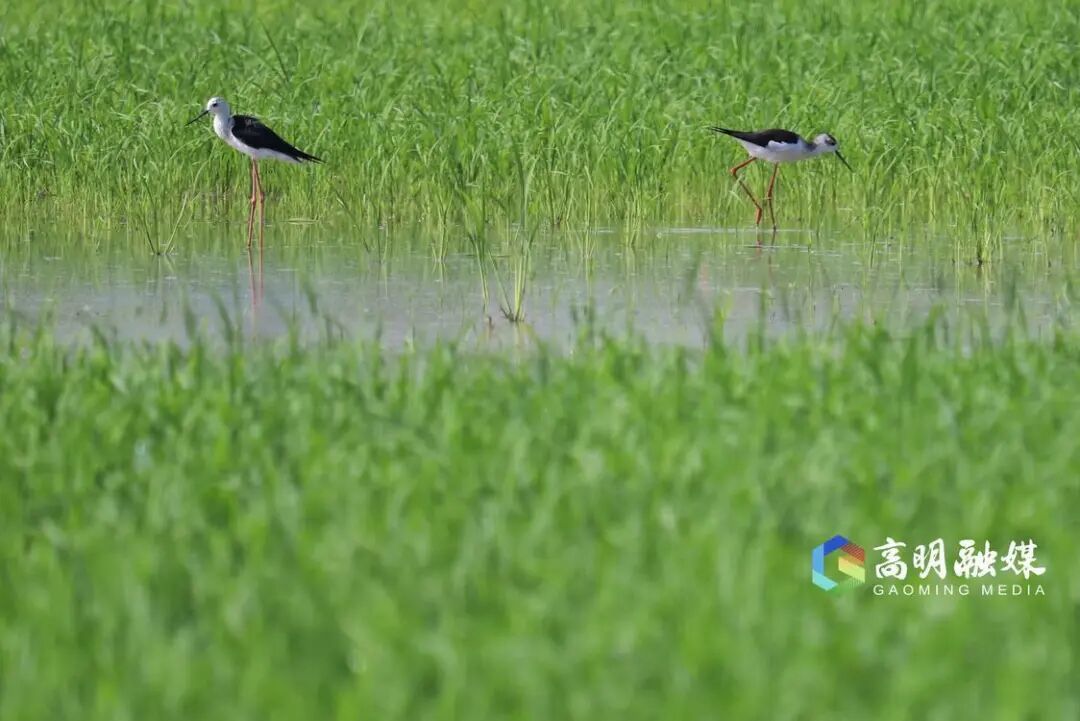 ▲黑翅长脚鹬修长的红色双腿在田间格外醒目。曾锦峰摄