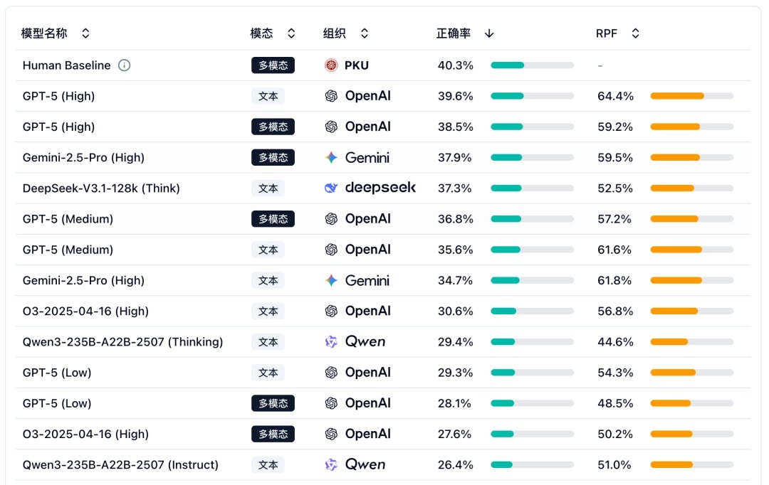 在这场精心设计的考试中,人类展现出了复杂的科学直觉。作为基线,参与测试的北大化院本科生取得了40.3%的平均准确率。这个数字本身,就足以说明这套题目的硬核程度。