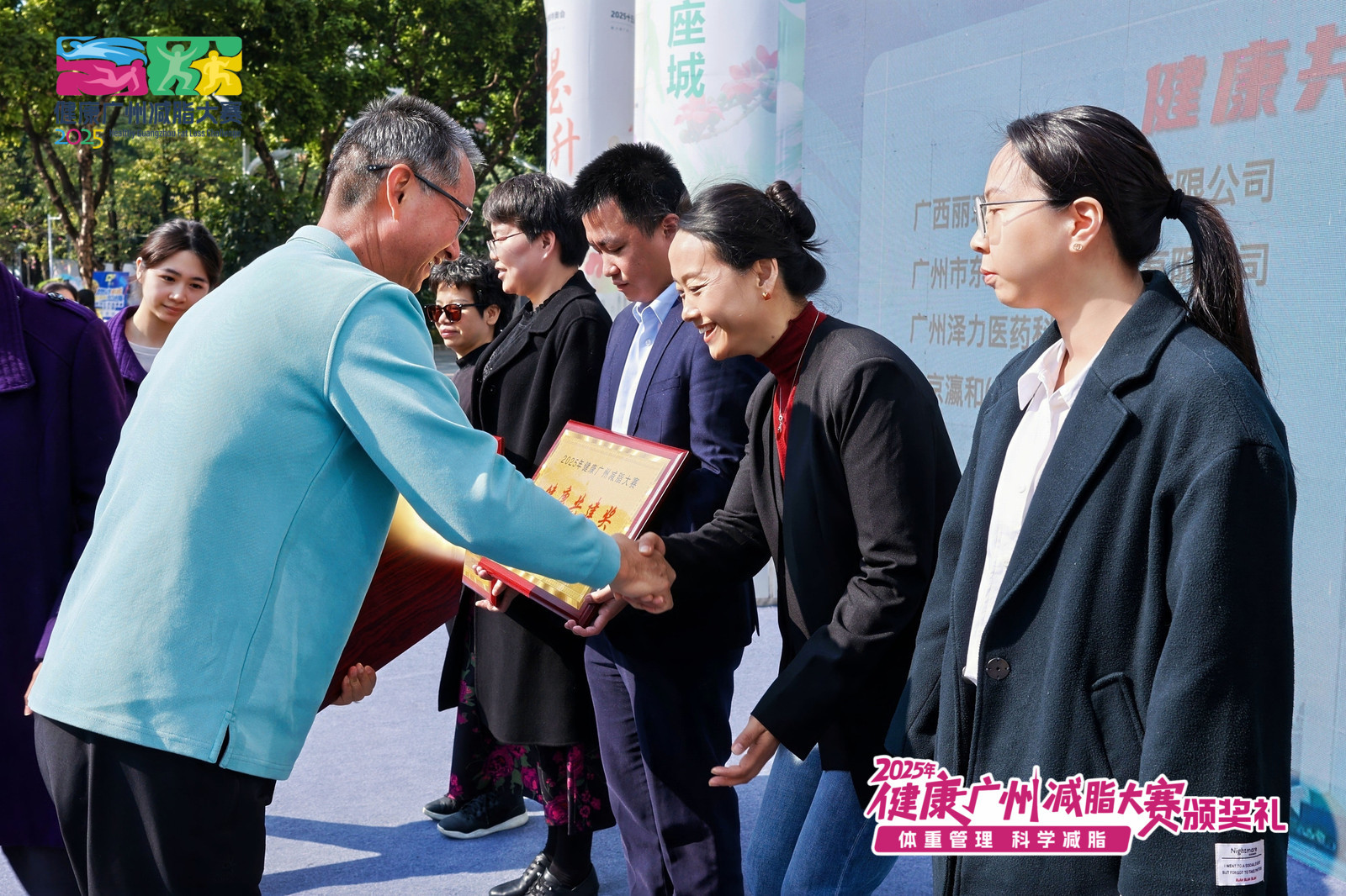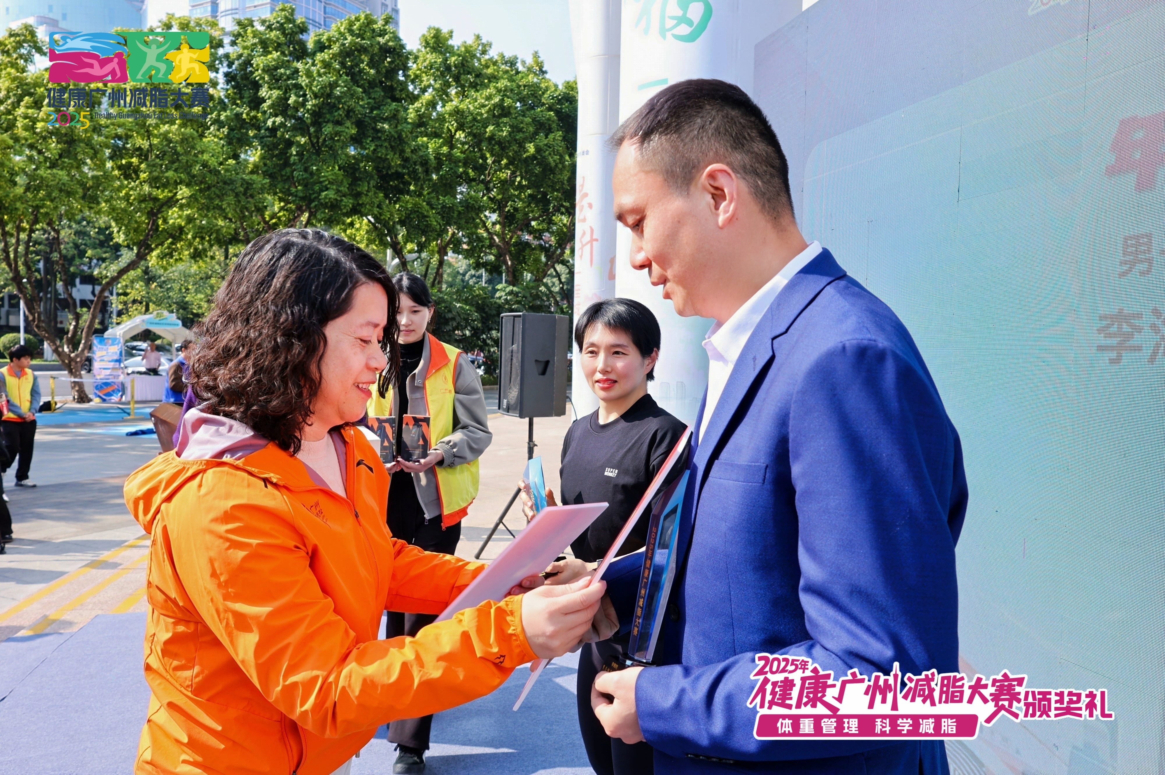 颁奖仪式上,男子组总冠军李海明、女子组总冠军朱艳莉分享了科学减脂的经验与收获,并荣获组委会颁发的“广州健康大使”称号。47岁的李先生表示:“从血脂超标到恢复正常,这次减脂让我真正懂了‘健康是底气’。希望大家都能从‘管住嘴、迈开腿’开始,对自己的身体负责。”他体脂率从22.8%降至16.7%的蝶变,也成为现场不少市民的“减脂动力”。42岁的朱女士则表示:“我通过调整饮食和加强运动,把体脂率从25.6%减到16.9%,我想告诉大家‘减脂不用急,坚持就有惊喜’。”现场响起阵阵共鸣的掌声。大赛组委会同时表彰了一批优秀团队和合作单位。