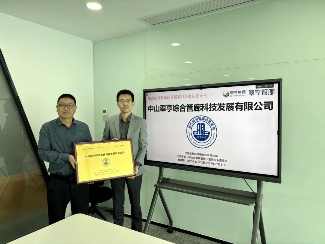 近日,中山翠亨综合管廊科技发展有限公司(以下简称“翠亨管廊公司”),凭借扎实的运营实力、专业的服务能力与完善的管理体系,成功获得中国市政工程协会管廊及地下空间专业委员会与中国建筑科学研究院有限公司联合颁发的国内首张城市综合管廊运营服务能力四星级认证证书。