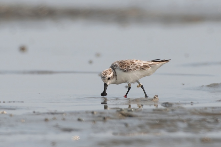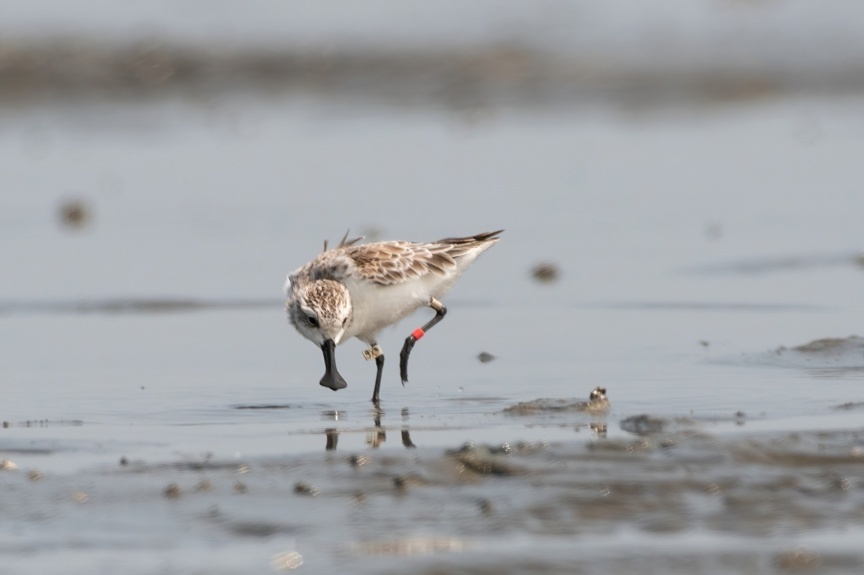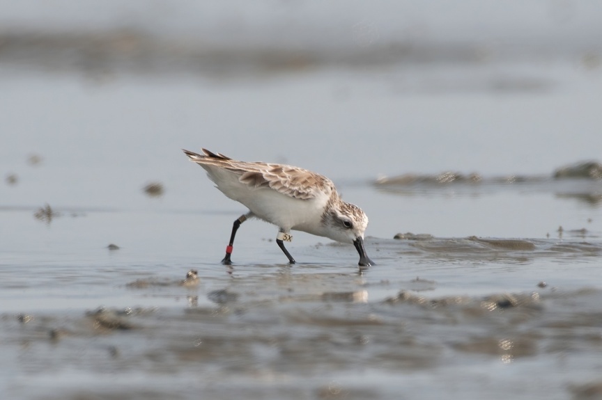 勺嘴鹬5X,2019年7月2日在“偷蛋计划”中出生,当年在湛江越冬期间多次被记录,最近一次公开的观察记录是在2020年4月12日 | 小鸽