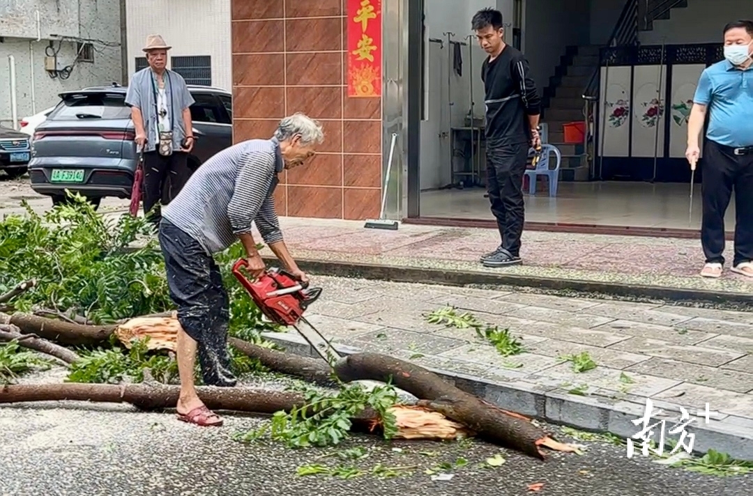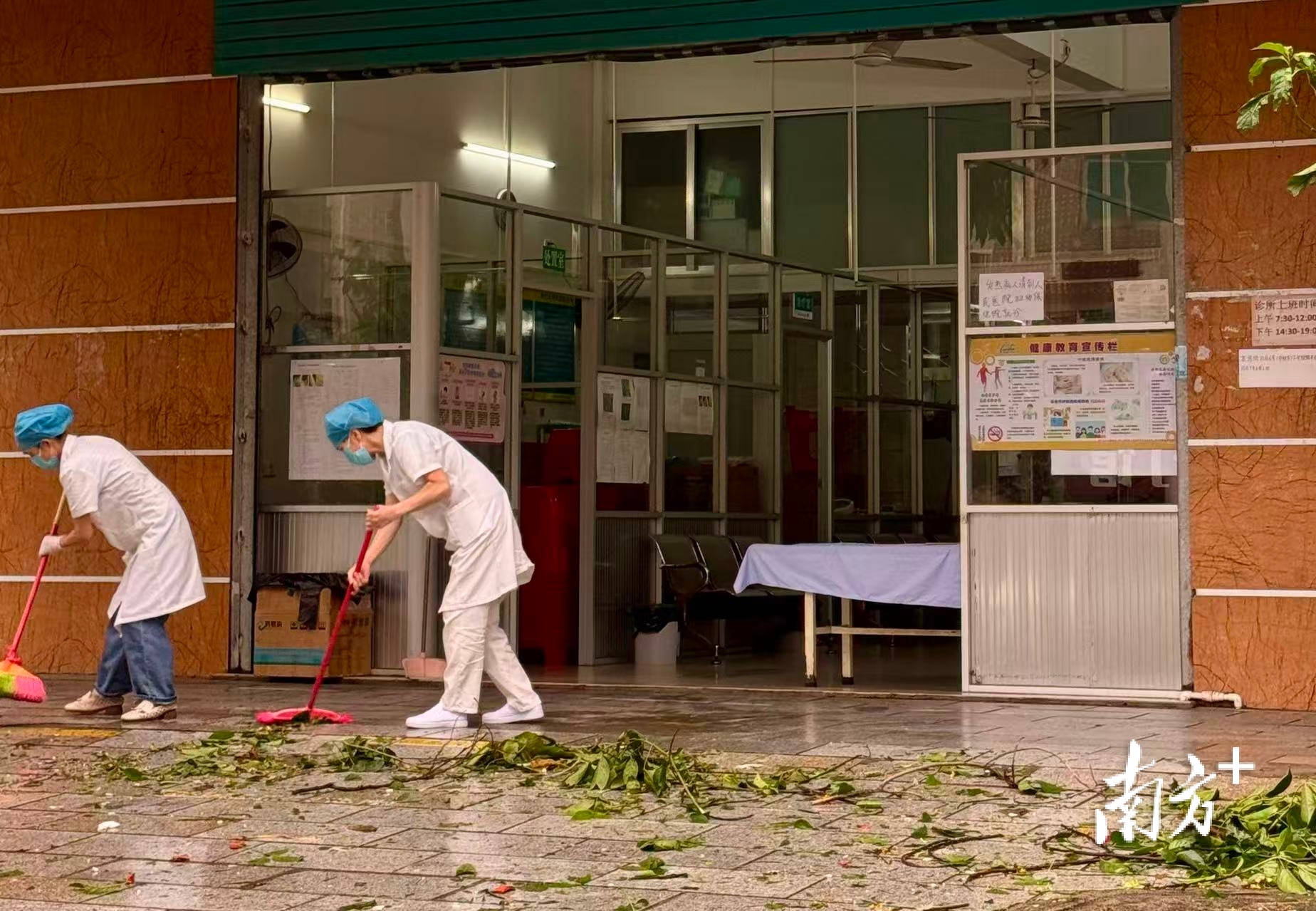 但风雨刚歇,这座县城的生命力便开始涌动。早上7时许,一家诊所门前已基本清理完毕,医护人员正仔细扫除最后几片残叶。沿街可见拿着工具清理断枝的居民,也有商铺店主们修补被狂风损坏的招牌。