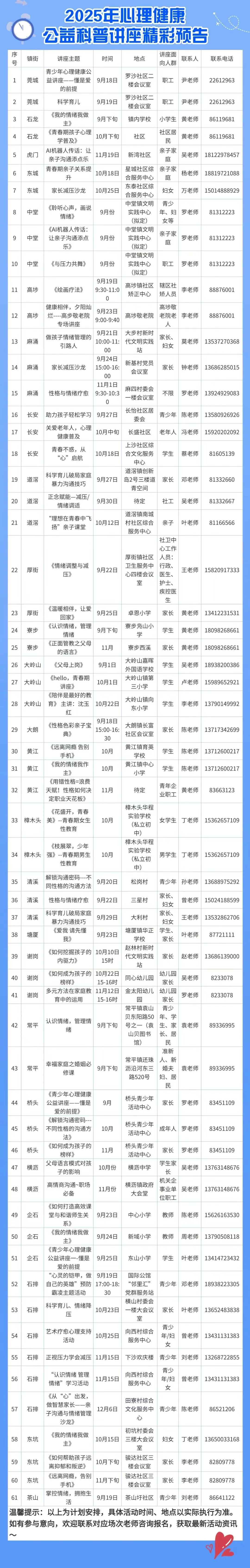 自“一村一师”计划实施以来,全市已累计开展心理健康公益科普讲座62场,覆盖青少年、妇女、企业职工等群体。接下来,东莞市委社会工作部将组织心理健康类社会组织在年内继续再推61场心理健康公益科普讲座,邀请广大市民共赴“心”旅程。
