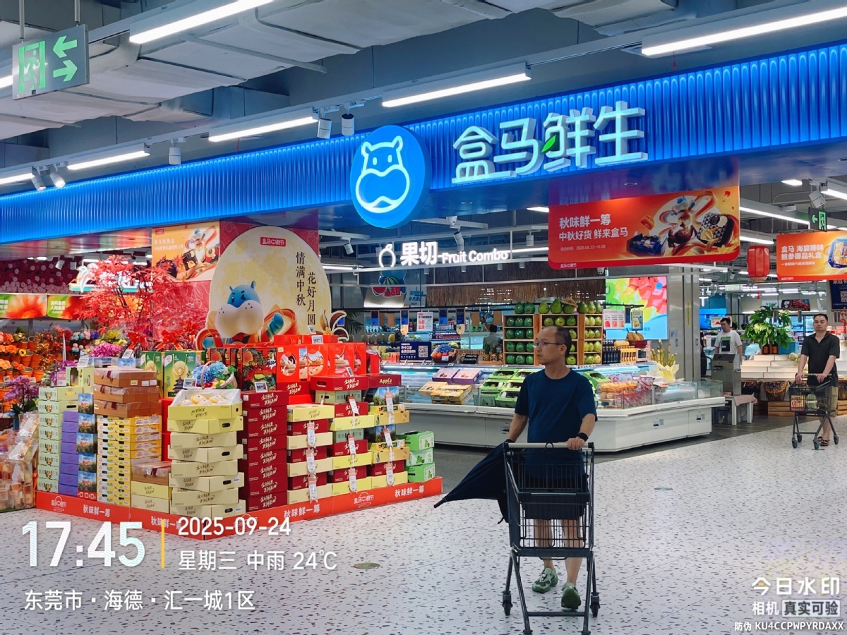 在南城盒马门店内,货架上的蔬菜、肉类、粮油、蛋奶等生活必需品摆放整齐,市民手持购物篮,在生鲜区、粮油区从容挑选商品。