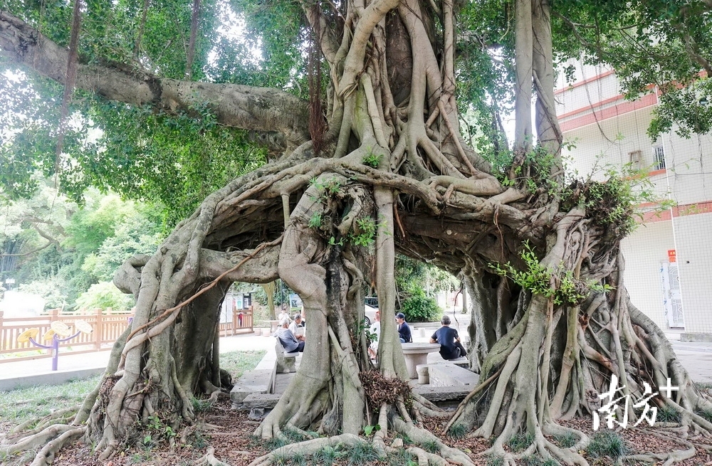 村民在“屋仔树”下乘凉,这棵造型独特的古树早已是里溪村的网红打卡点。 南方+ 叶志文 拍摄