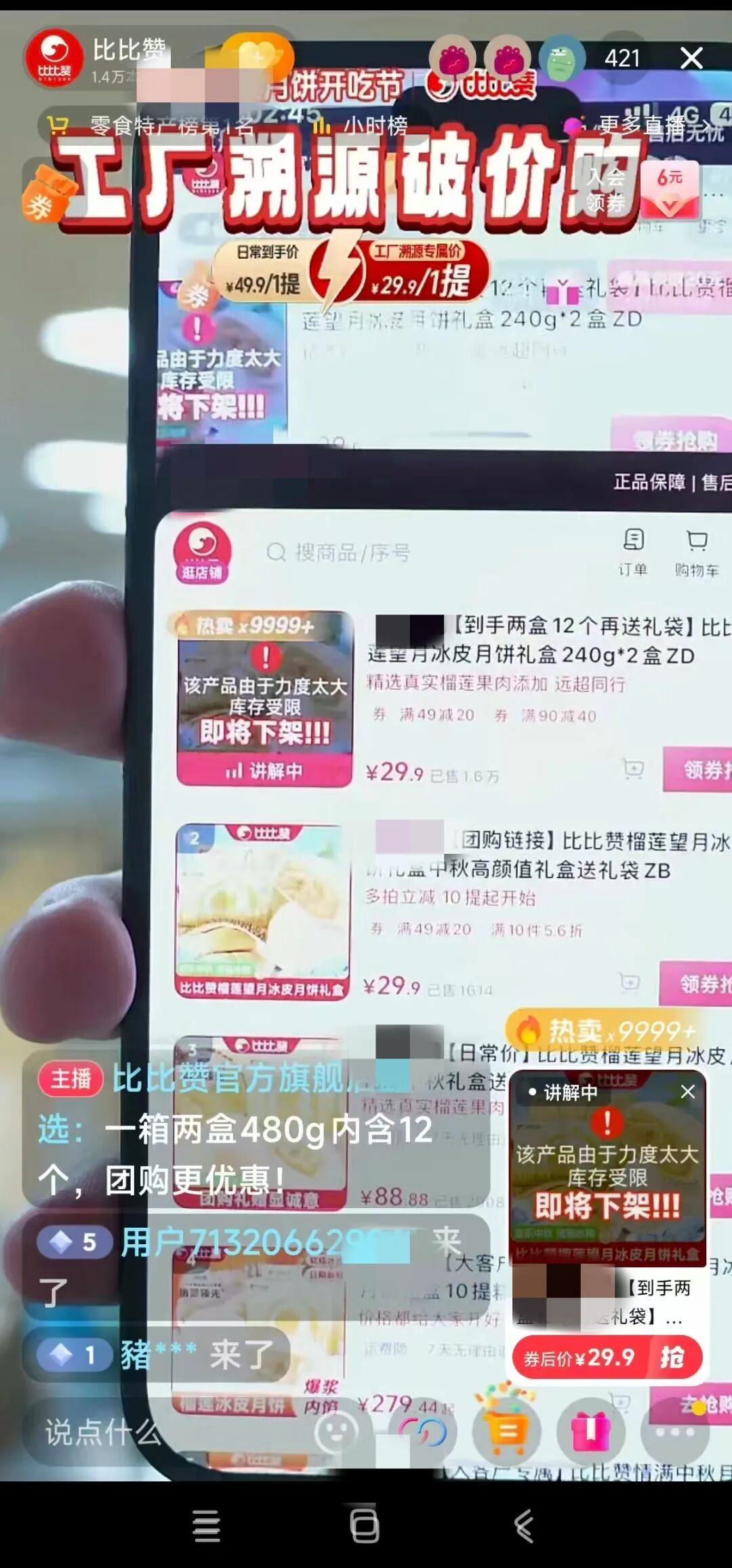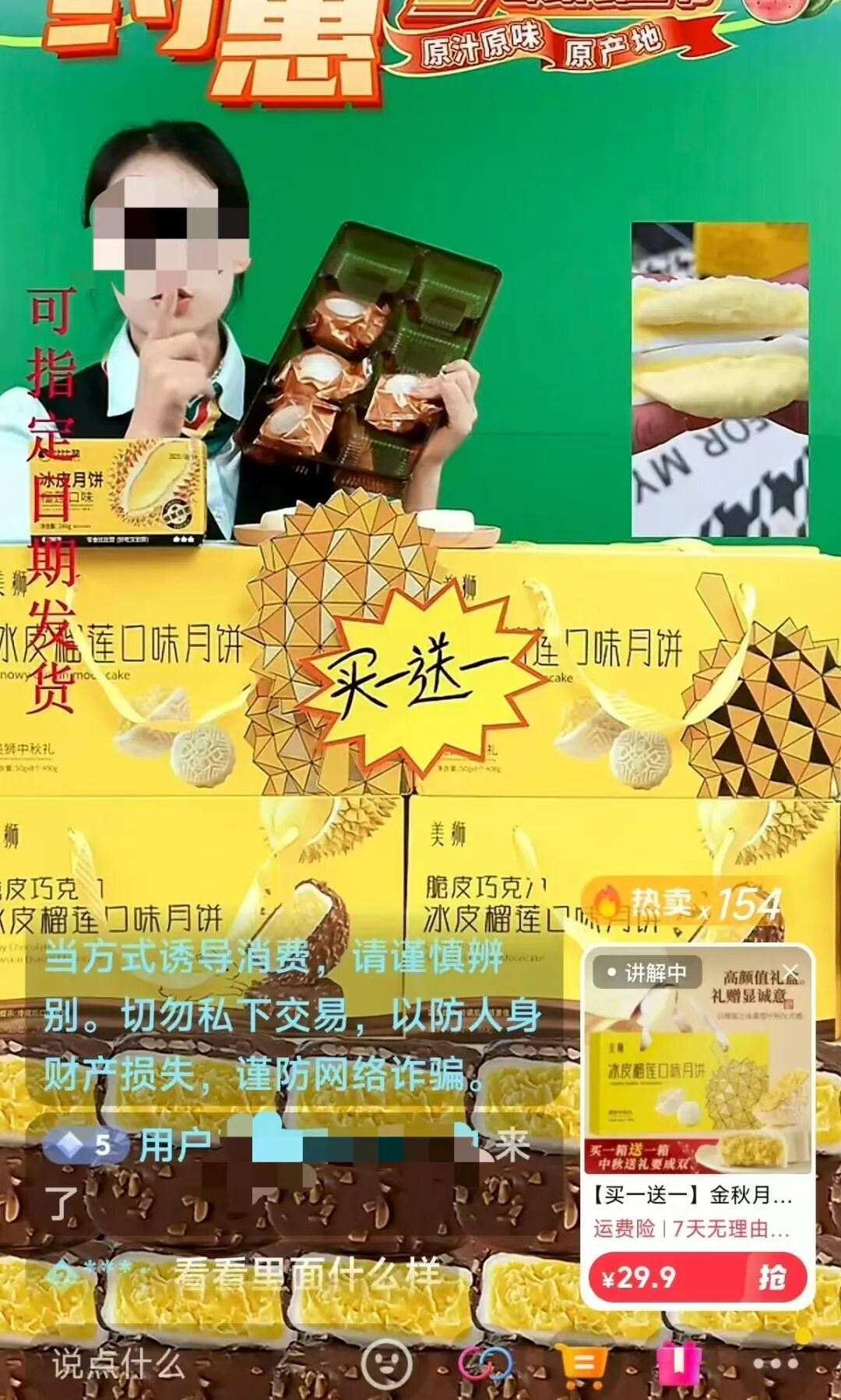 ▲“比比赞官方旗舰店甄选”直播间,主播展示1号链接榴莲冰皮月饼,写有“精选真实榴莲果肉添加”。直播间截图