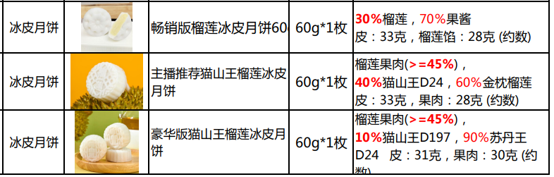就店内不同价格榴莲冰皮月饼之间有何区别,客服解释称,“都是榴莲,含量不一样”。产品报价单显示,其“畅销版”产品中含有30%榴莲、70%果酱;“主播推荐款”产品中,榴莲果肉“≥45%”,其中含有40%猫山王榴莲(D24),60%金枕榴莲;“豪华版”产品中榴莲果肉“≥45%”,其中含有10%猫山王榴莲(D197),90%苏丹王榴莲(D24);“至尊版”产品中榴莲果肉同样不少于45%,其中猫山王榴莲(D197)占比30%,苏丹王榴莲(D24)占比70%。
