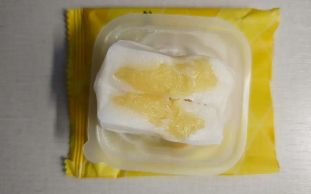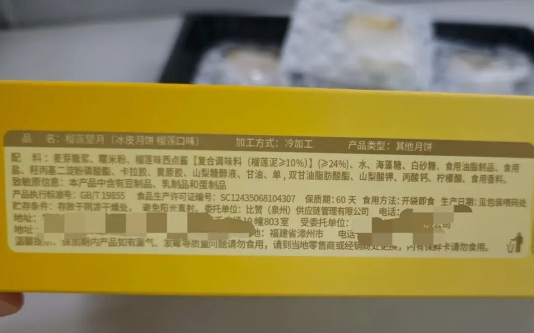 除榴莲味西点酱外,该月饼中还添加了羟丙基二淀粉磷酸酯、卡拉胶、山梨糖醇液、甘油、丙酸钙、柠檬酸、食用香料等食品添加剂,与主播的口中“用榴莲酱或香精勾兑”的产品没有区别。仔细查看产品包装可以发现,其实质是一款“榴莲口味”冰皮月饼。