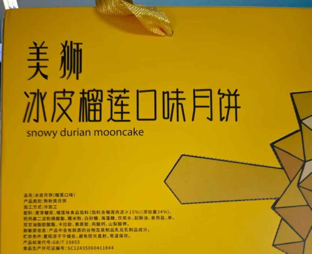 ▲美狮冰皮榴莲口味月饼产品信息。 新京报首席记者 郭铁 摄