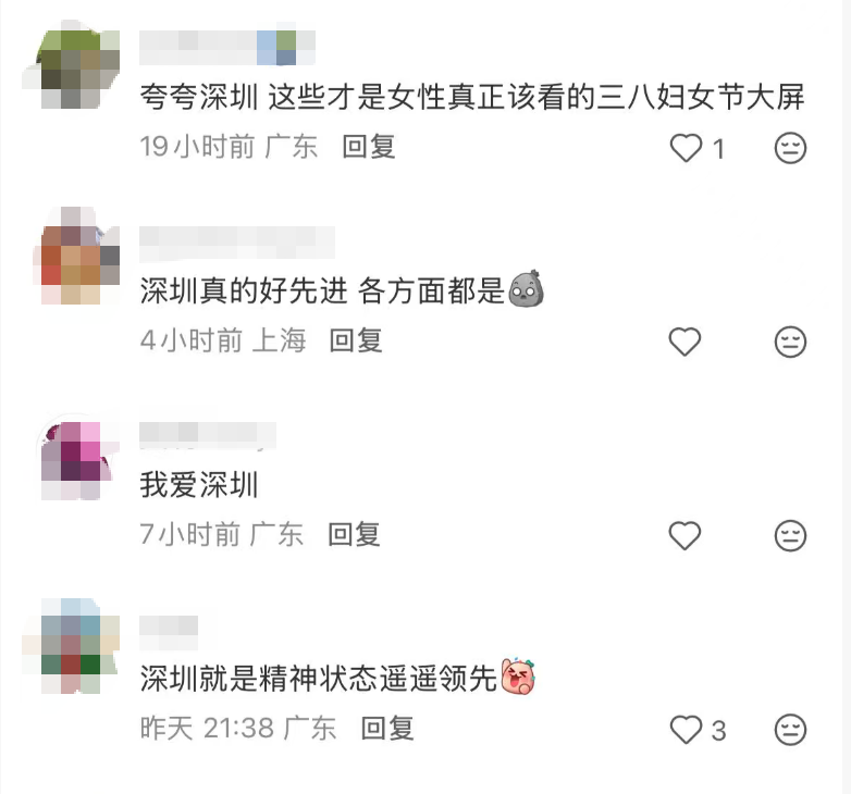 社交网络上,许多网友都在赞叹“这才是我们需要展现的女性力量”““夸夸深圳!这才是女性该看的三八节祝福大屏”……