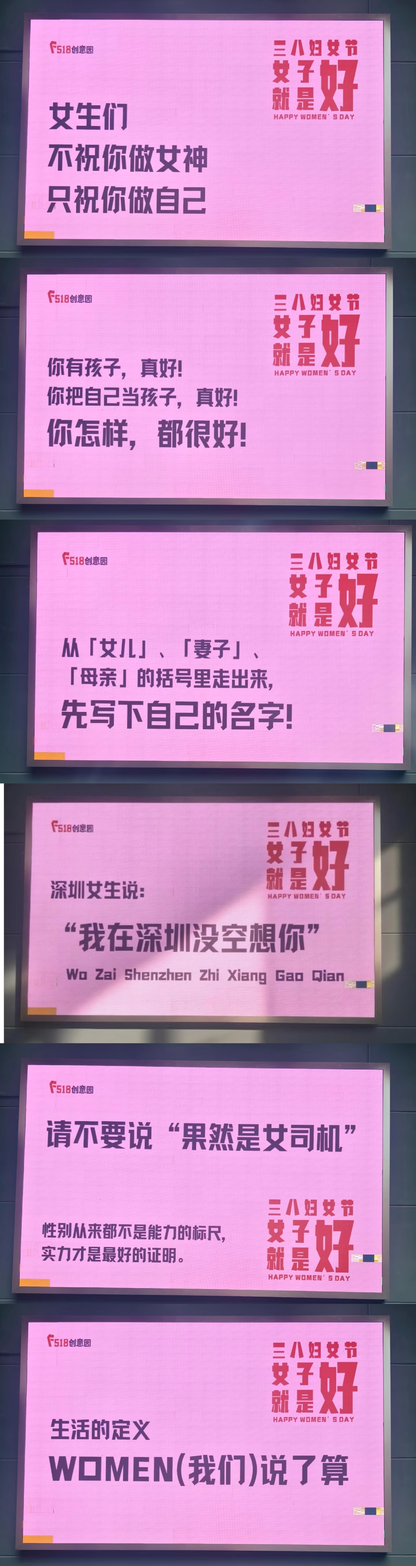 “Women好,我们好”“女,本就是好 好!好!好!”“深圳女生无需被定义”……话语简短,充满力量。