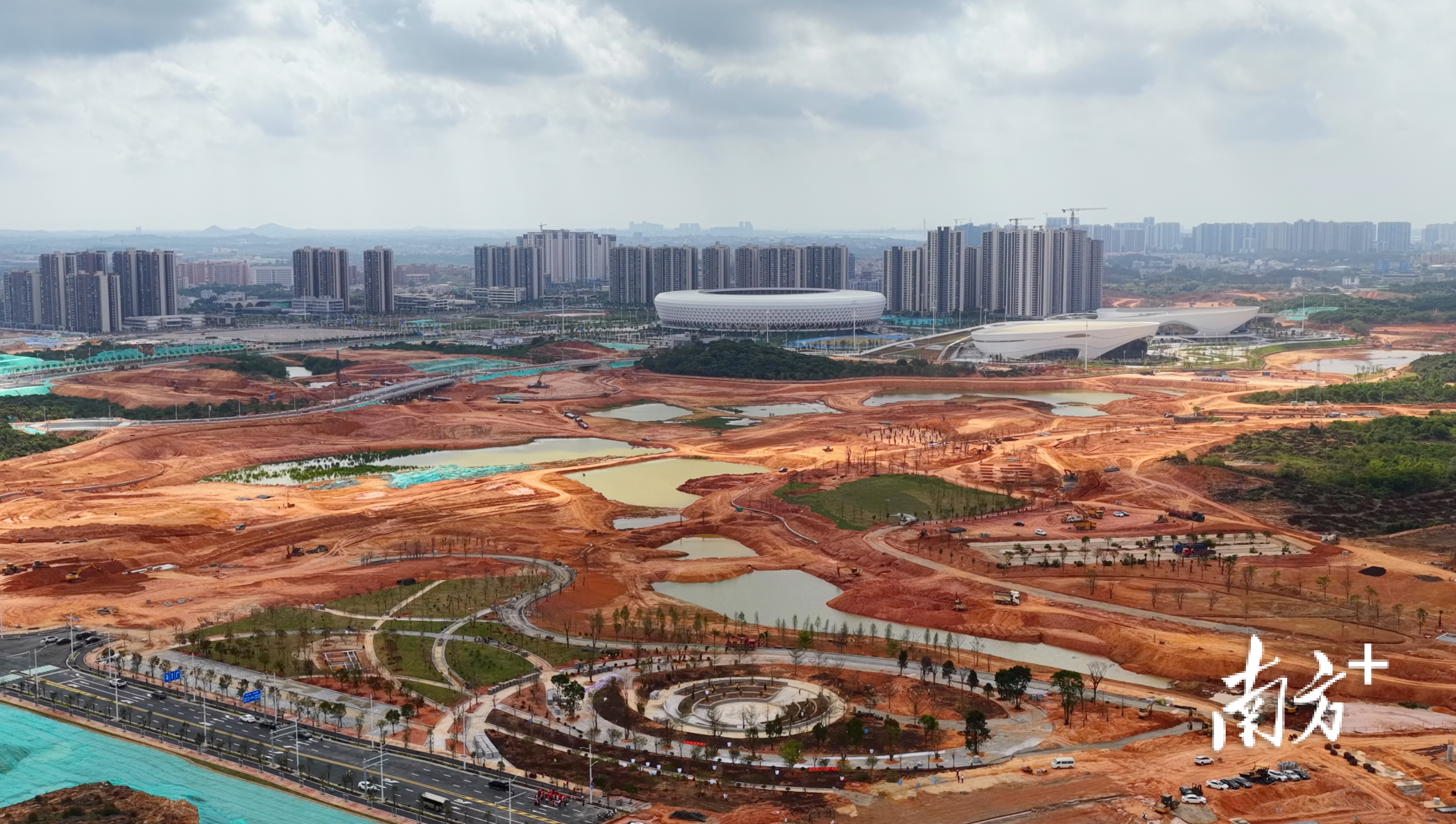 作为茂名新城“城市绿芯”,中央公园规划建设尽显生态担当。公园占地4256亩,以“一河一湖三区五道八景”为景观架构,预留56万平方米水体打造共青河湿地,同步推进河道清污、岸线修复、水动力激活等五大工程。目前该项目已完成清表和驳岸桩施工,预计2026年5月底实现蓄水,建成后将呈现“一城公园半城湖”的美好图景。