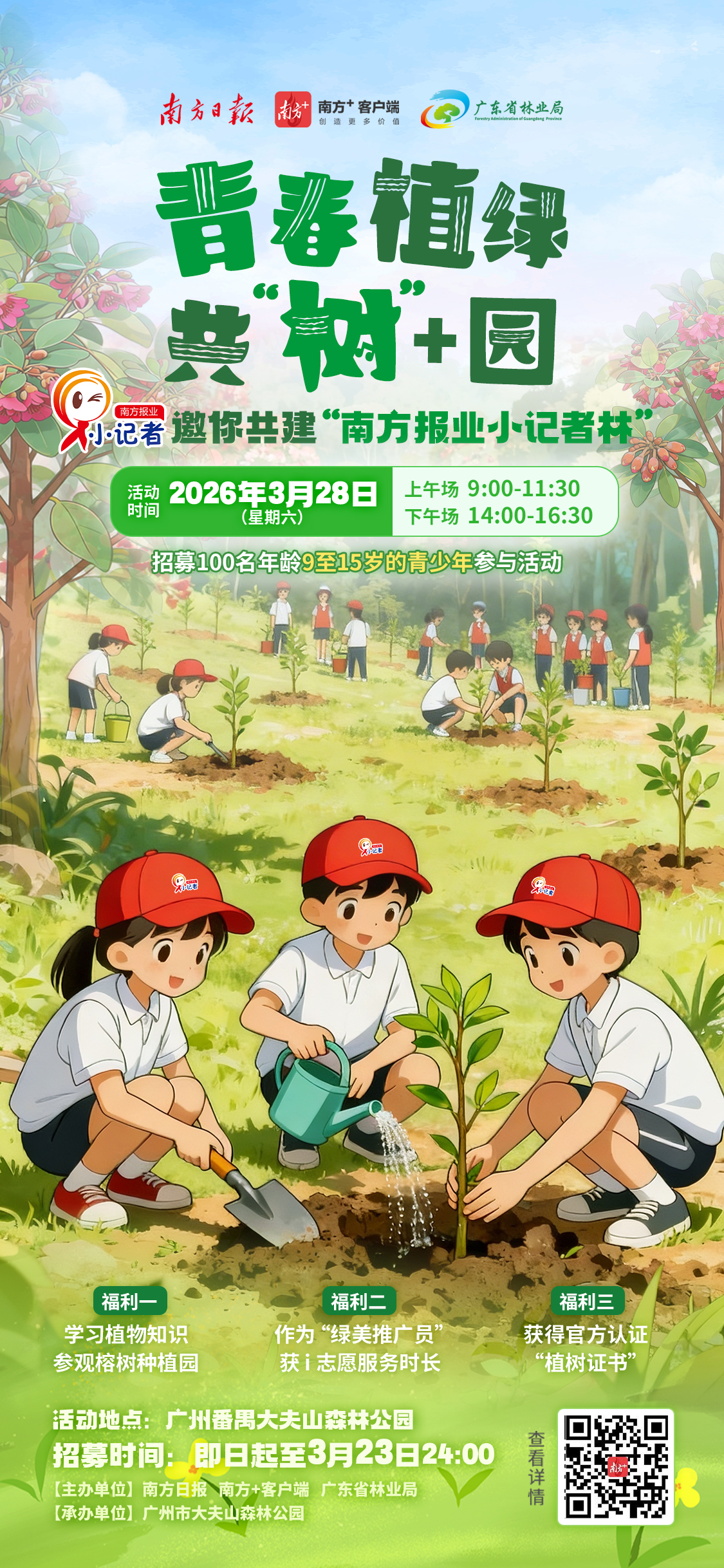 本次活动将招募100名小记者,3月28日(周六)在素有“番禺氧吧”之称的广州大夫山森林公园举行,分上午、下午两场。依托公园丰富的生态资源,活动将融入植物科普、植物研学与公益实践,现场为小记者免费提供一棵树苗、一套植树工具。参与活动的小记者将获得“南方报业小记者林”植树活动“i志愿”服务时长,以及官方认证的“植树证书”。