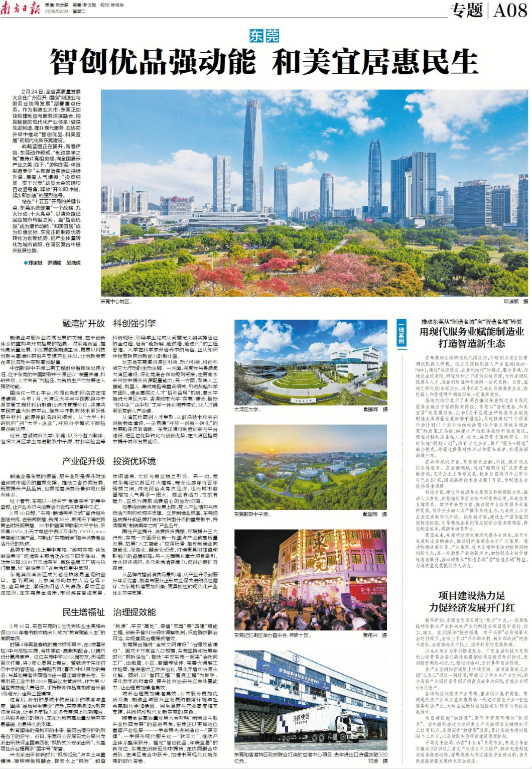 随着全省高质量发展大会吹响“制造业与服务业协同发展”的奋进号角,东莞正以更高站位重塑产业格局——一手做强先进制造这一“硬支撑”,一手提升现代服务这一“软实力”,推动产业体系整体跃升。锚定“智创优品、和美宜居”的新定位,东莞在创新驱动中提质,在协同融合中进阶,在湾区竞合中跃升,加速书写现代化新东莞的时代答卷。