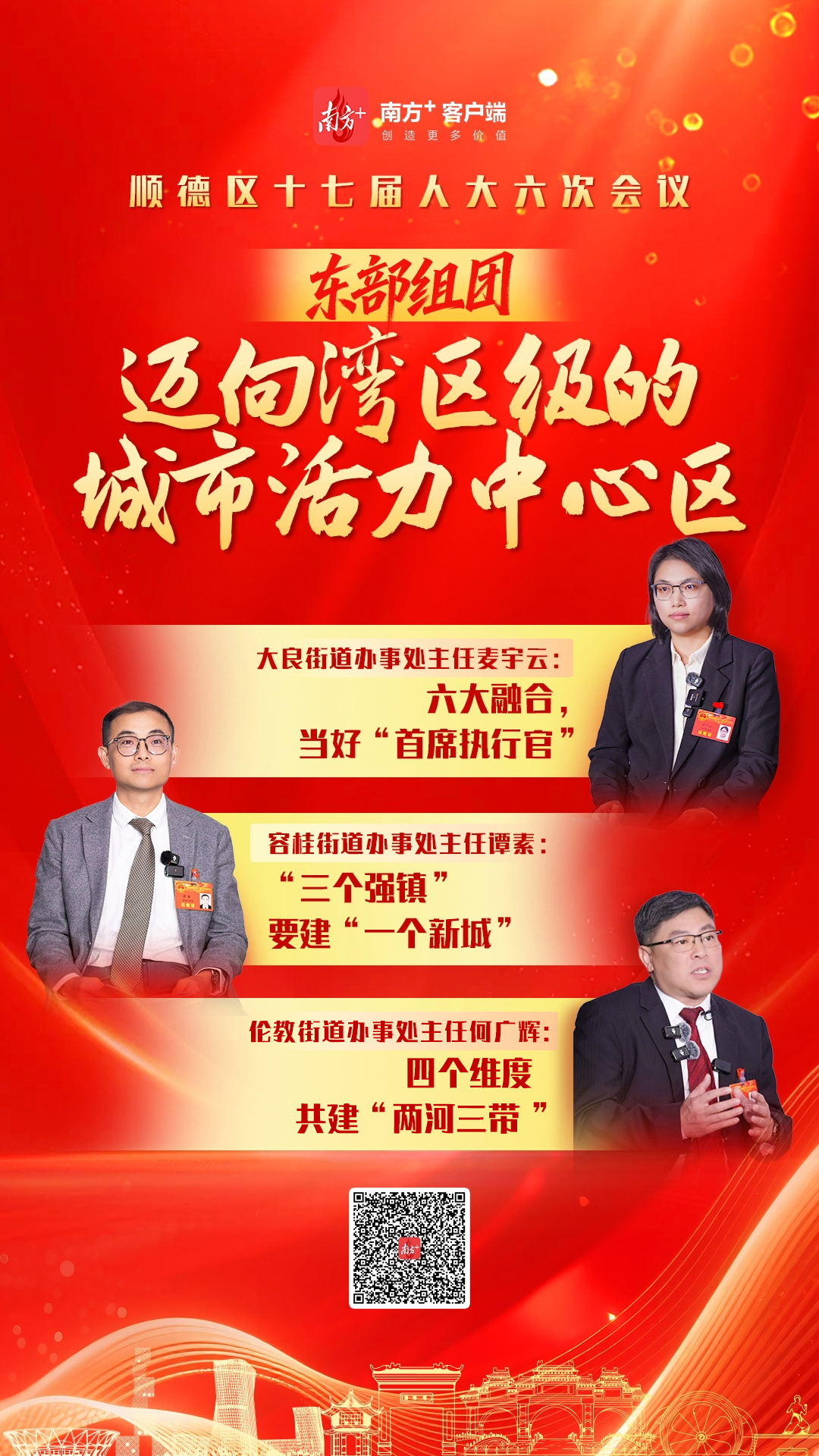 从2009年首次提出“一城三片区”,到如今站在“十五五”开局节点上的战略再升级,顺德正通过打破行政壁垒、深化片区融合,推动区域协同发展。作为顺德的中心城区,东部组团(大良、容桂、伦教)被赋予“高品质现代化新城”和“东部开放港”的全新定位。三位街道办事处主任以组团形式接受媒体联合采访,围绕新格局下的角色定位与协同发展路径,分别畅谈了各自的思考与举措。