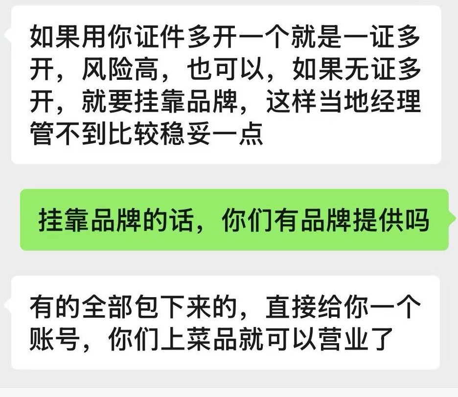 3月13日,记者以外卖店主身份暗访发现,在闲鱼等平台上,中介普遍提供两种“一店多开”服务:一是“一证多开”,查处风险高;二是“挂靠品牌”,可规避监管,收费1500元/次,承诺“直接给账号、上餐即可营业”,甚至无需相关证件。