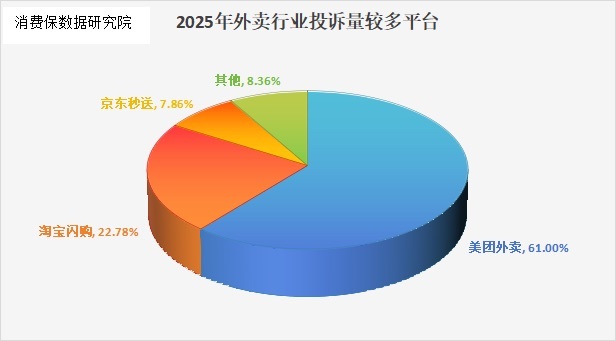 近年来,外卖市场规模接近餐饮行业总收入1/4,但是投诉率居高不下,根据消费保平台数据,美团外卖、淘宝闪购和京东秒送三大平台的投诉数据占比分别达61.00%、22.78%和7.86%,核心问题主要集中在服务态度差、食品安全以及不处理等。
