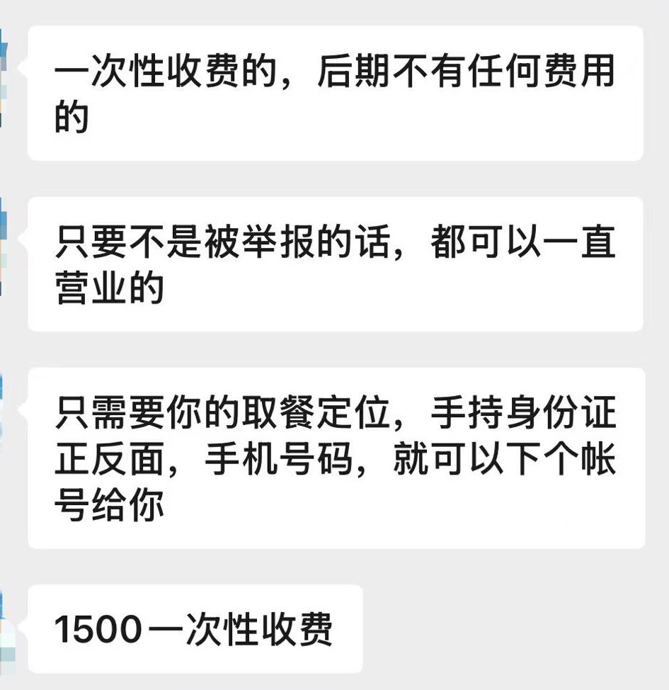 甚至出现一条龙代办外卖店铺的中介。其声称,无需营业执照和餐饮许可,仅提供取餐地址和手持身份证照片,数天内就能包装出“正规”连锁外卖店,“全部包下来,直接给你一个账号,上菜品即可营业”。