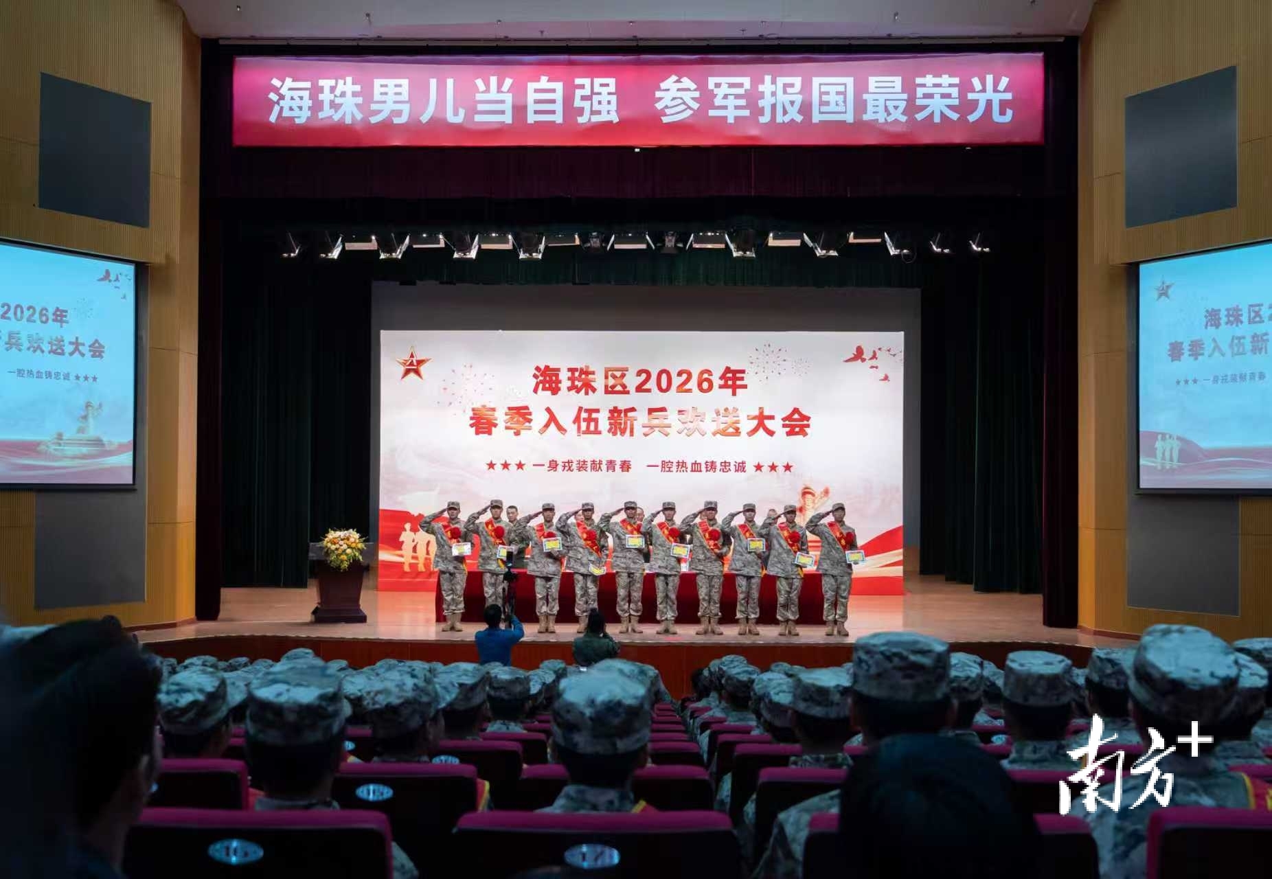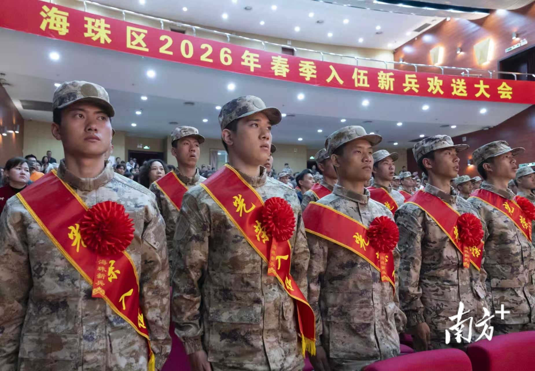 当天下午,在海珠区欢送大会现场,新兵们胸戴大红花、肩披红绶带,精神抖擞、整齐列队。欢送大会现场宣读批准新兵入伍命令,为新兵颁发《入伍通知书》。