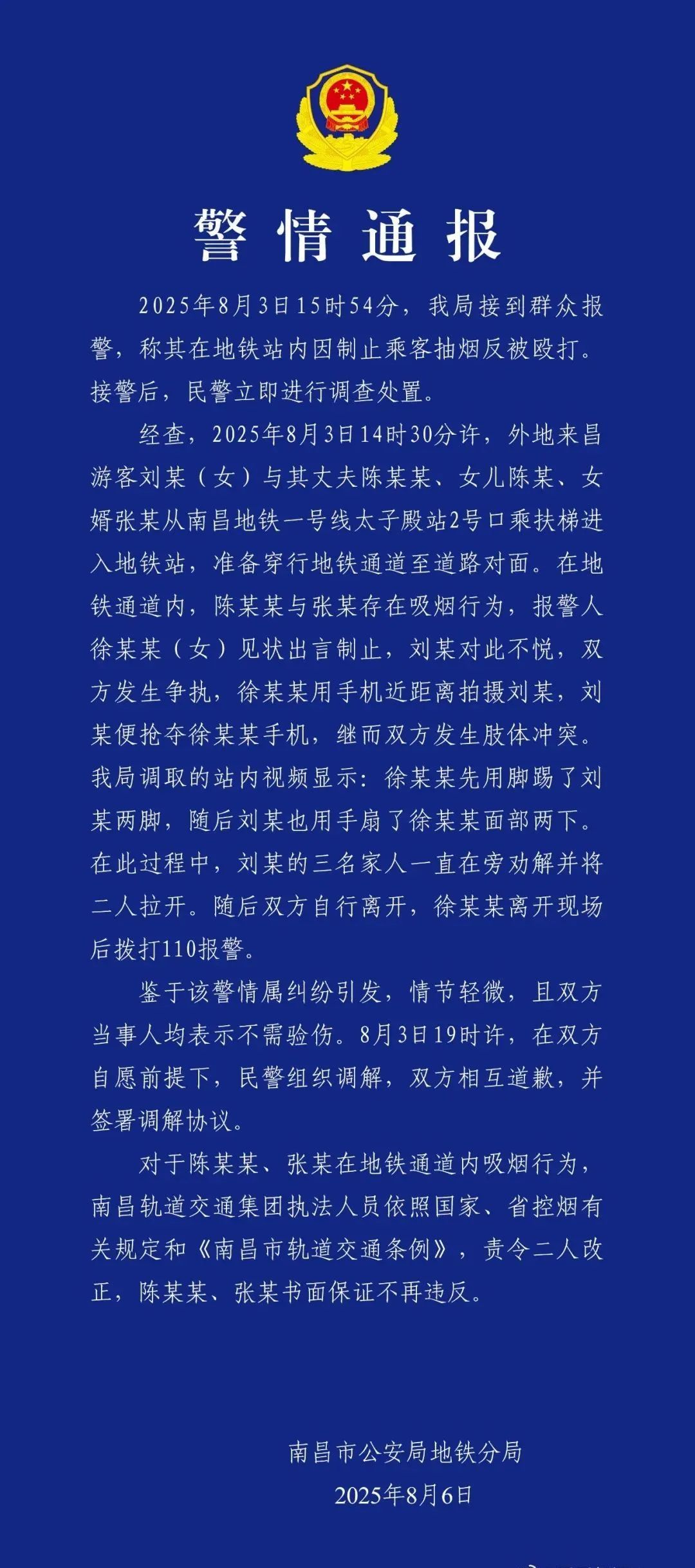 2025年8月3日15时54分,该局接到群众报警,称其在地铁站内因制止乘客抽烟反被殴打。接警后,民警立即进行调查处置。经查,2025年8月3日14时30分许,外地来昌游客刘某(女)与其丈夫陈某某、女儿陈某、女婿张某从南昌地铁一号线太子殿站2号口乘扶梯进入地铁站,准备穿行地铁通道至道路对面。在地铁通道内,陈某某与张某存在吸烟行为,报警人徐某某(女)见状出言制止,刘某对此不悦,双方发生争执,徐某某用手机近距离拍摄刘某,刘某便抢夺徐某某手机,继而双方发生肢体冲突。我局调取的站内视频显示:徐某某先用脚踢了刘某两脚,随后刘某也用手扇了徐某某面部两下。在此过程中,刘某的三名家人一直在旁劝解并将二人拉开。随后双方自行离开,徐某某离开现场后拨打110报警。