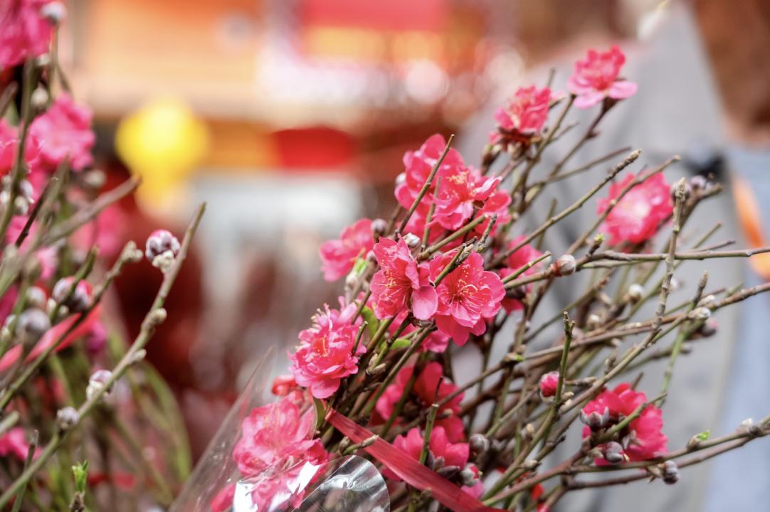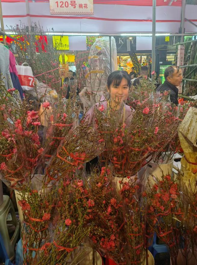 镜头定格的一瞬,是行花街的广府年味。而在花市,这样的幸福瞬间还有千千万万。不远处,何东站在自家的桃花档口,看着来来往往的人群,“我是卖花的人,我也是行花街的人,在其中感受着花市。”
