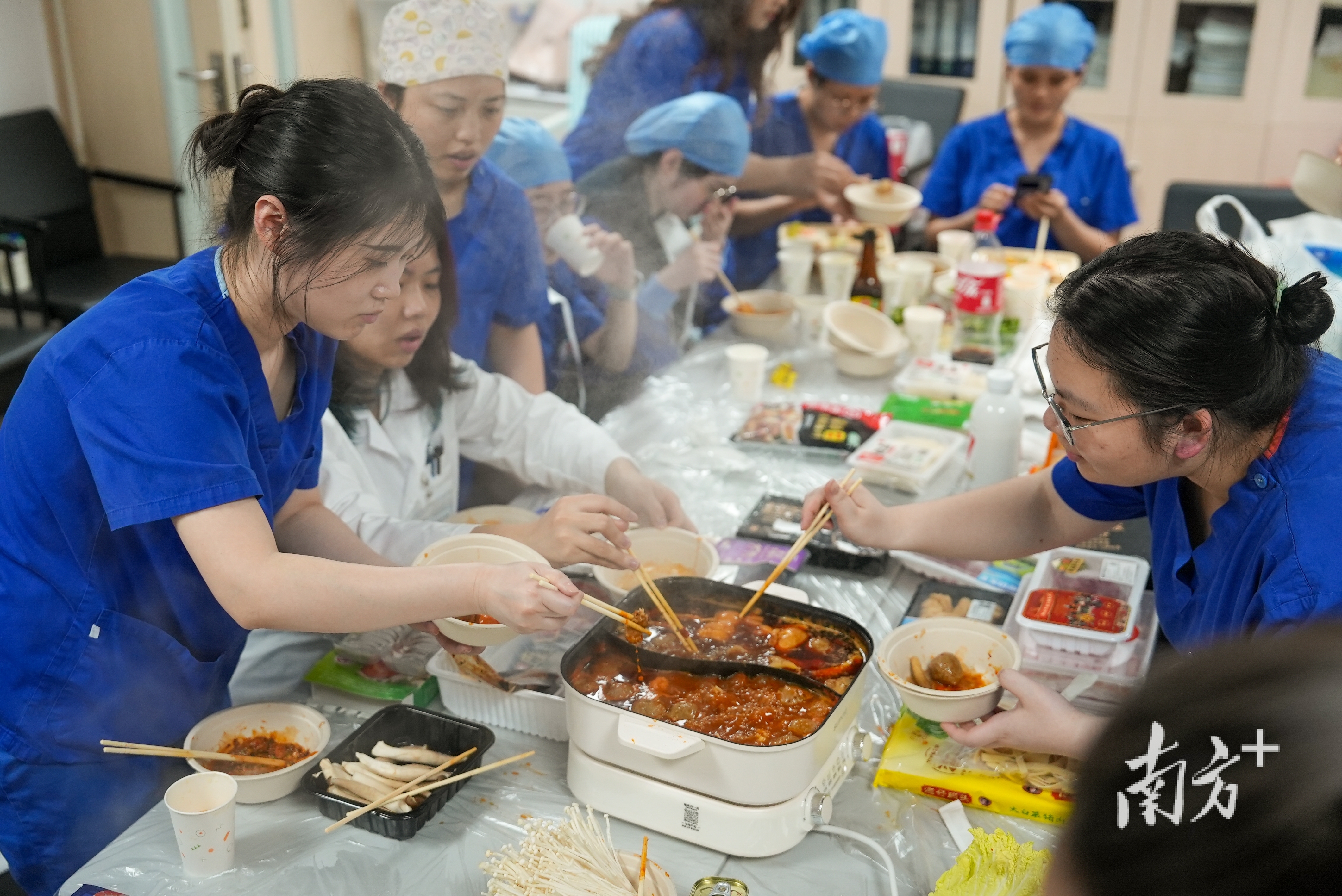 这顿年夜饭,一次次被打断。值班室里人来人往。有人刚从产房回来,匆匆吃上两口,又匆匆离开。