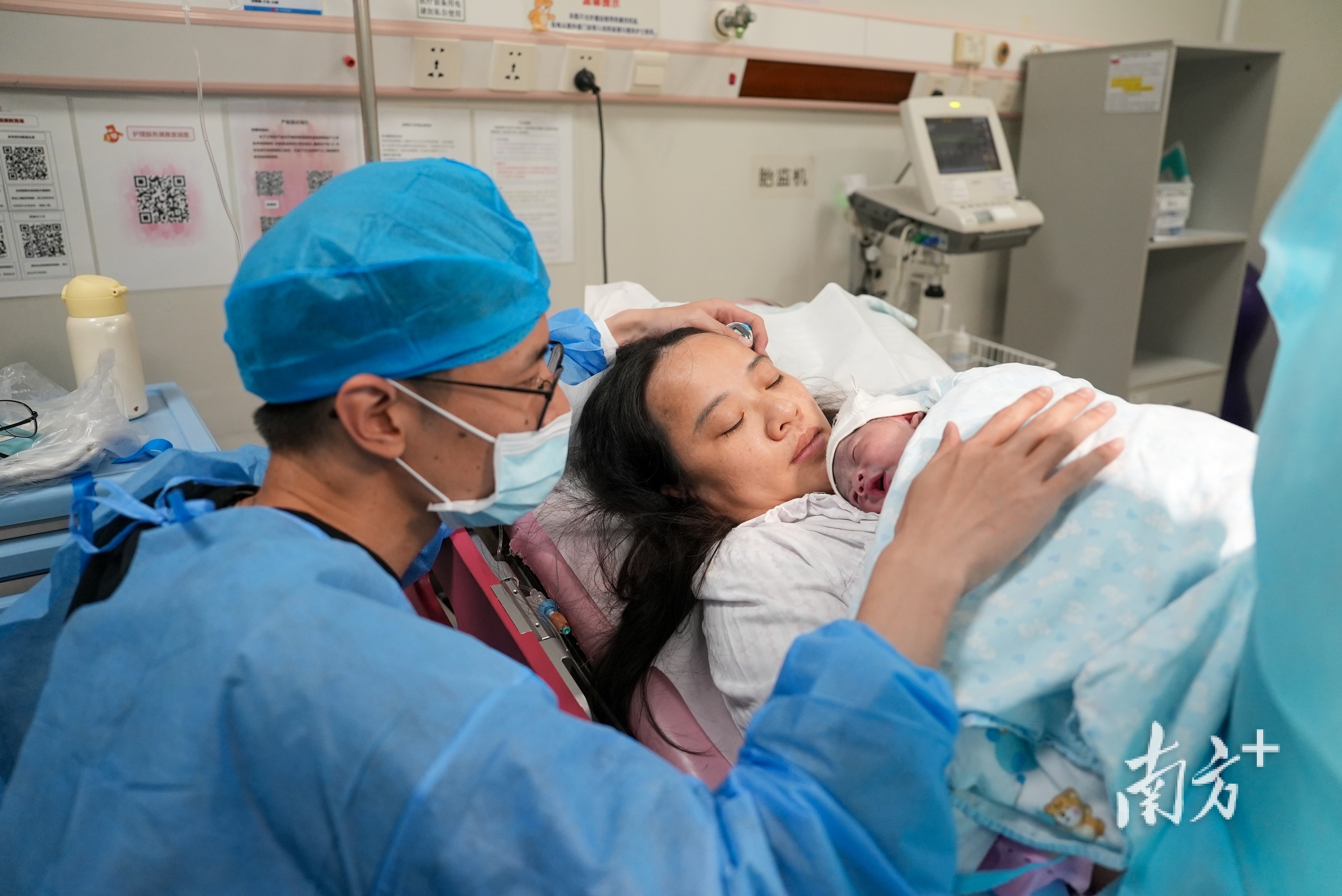 “用力!用力!”丈夫肖灿轻轻托着她的手,跟着助产士的节奏低声附和。