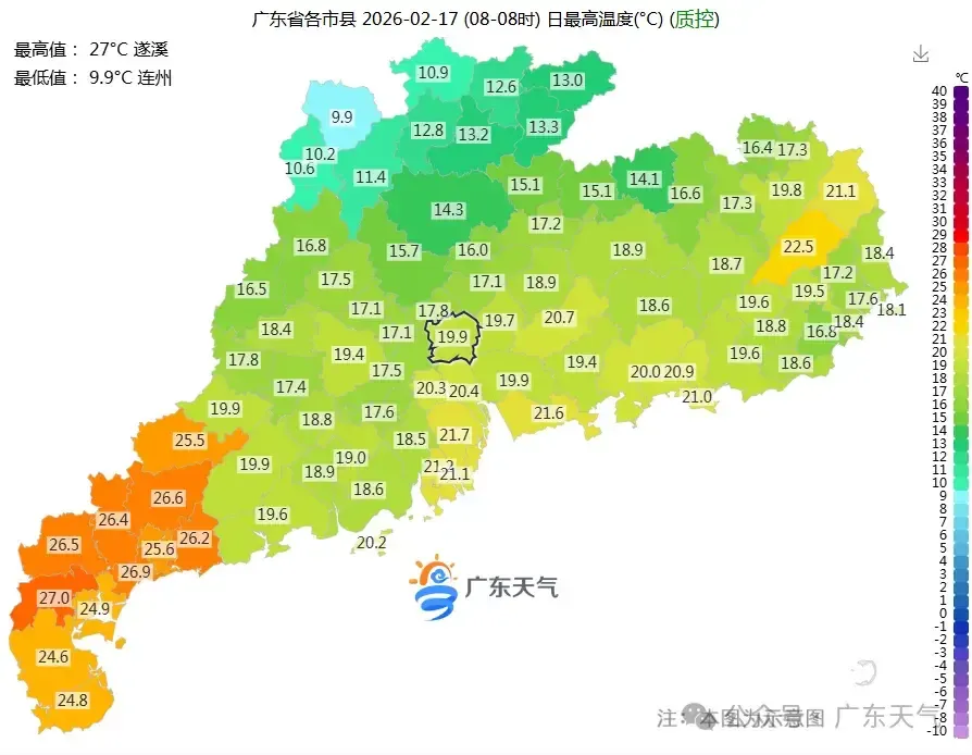 17日白天到18日早晨,受冷空气影响,广东日平均气温较16日明显下降,其中粤北、珠江三角洲北部市县下降了6~9℃,湛江、茂名市略降1℃左右,其余市县下降了3~5℃;白天最高气温:韶关及清远的大部市县介于10~15℃,湛江和茂名市县24~27℃,其余大部市县16~23℃,其中湛江遂溪录得全省最高气温27.0℃。