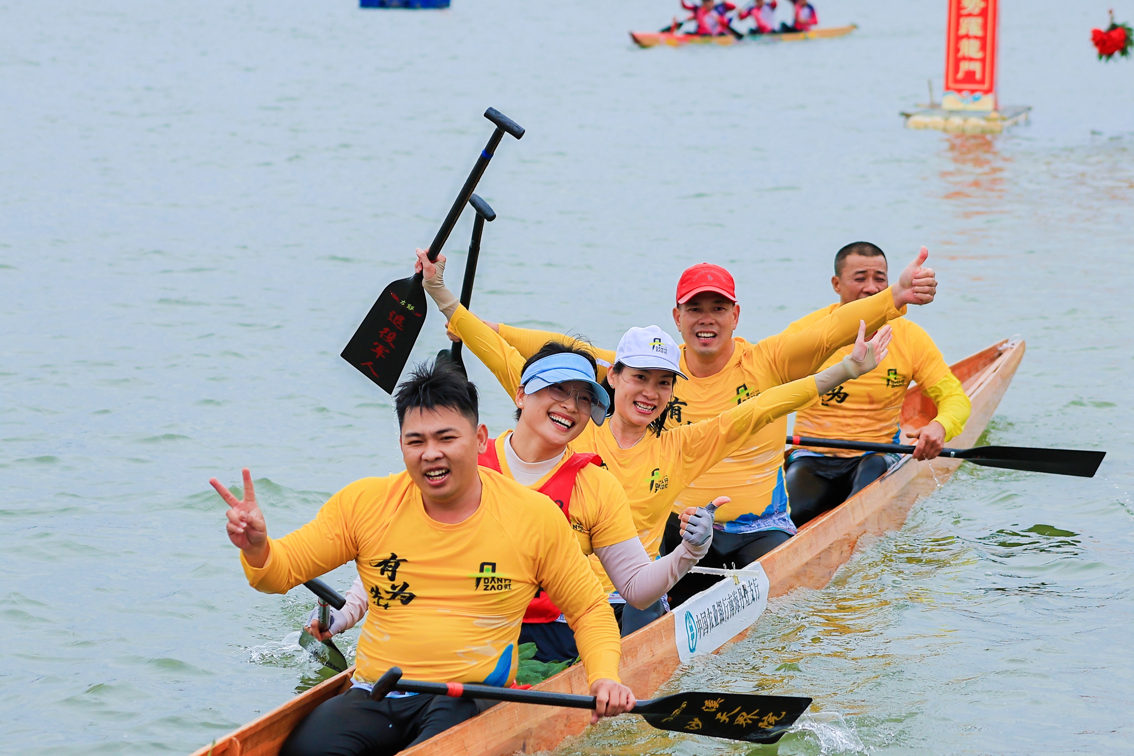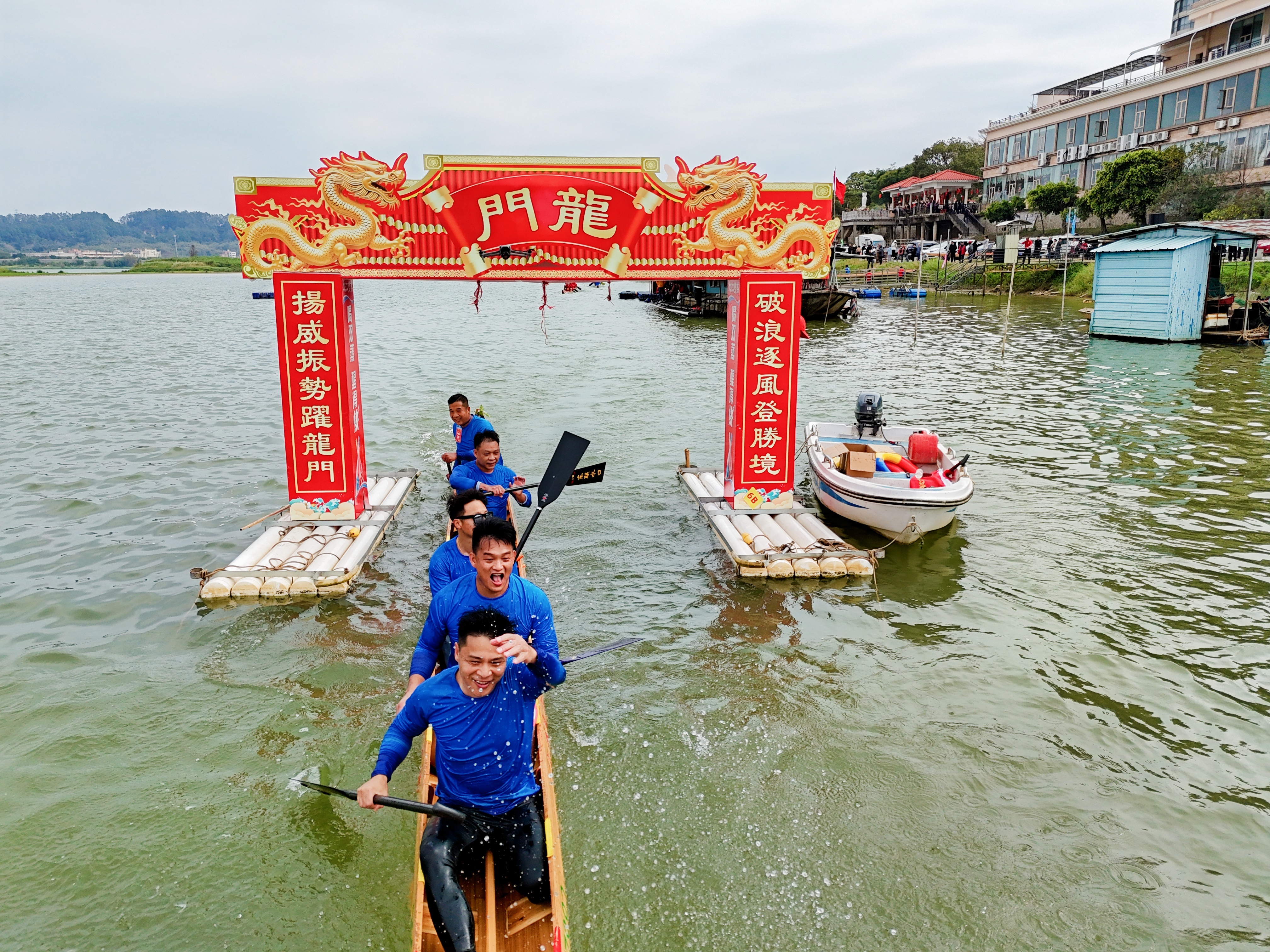 丹灶五人龙舟深受当地群众喜爱。图为一支丹灶五人龙舟队冲过龙门到达终点。通讯员供图