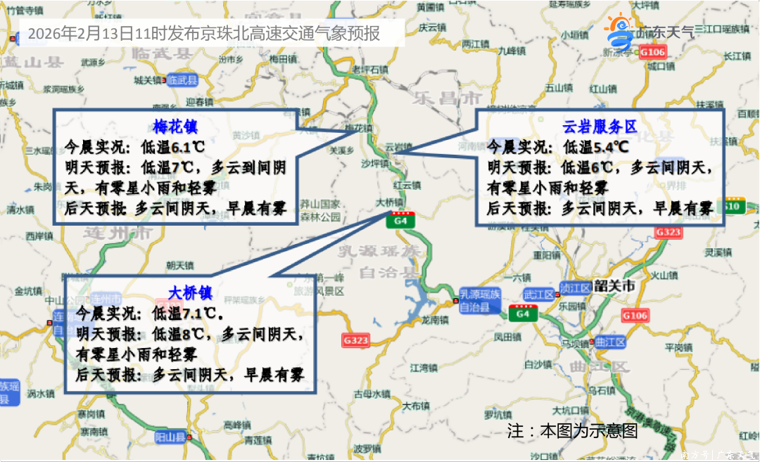 13日,韶关、清远、肇庆北部市县阴天间多云,有分散性零星小雨,其余市县多云间阴天,局部有小雨,大部市县早晨有轻雾局部大雾。