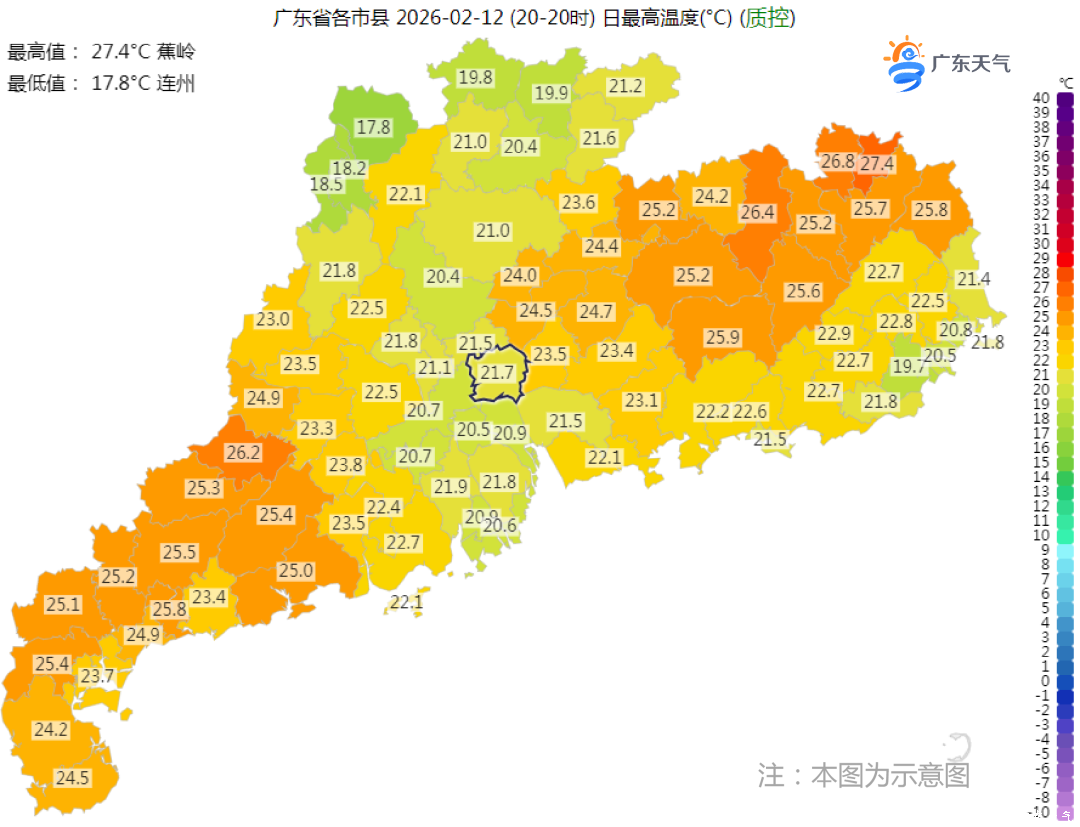 春节前广东气温仍在回升,昨天(2月12日)白天最高气温:粤东、珠三角、韶关、清远市县18~23℃,其余市县24~27℃,其中梅州蕉岭录得全省最高气温27.4℃。