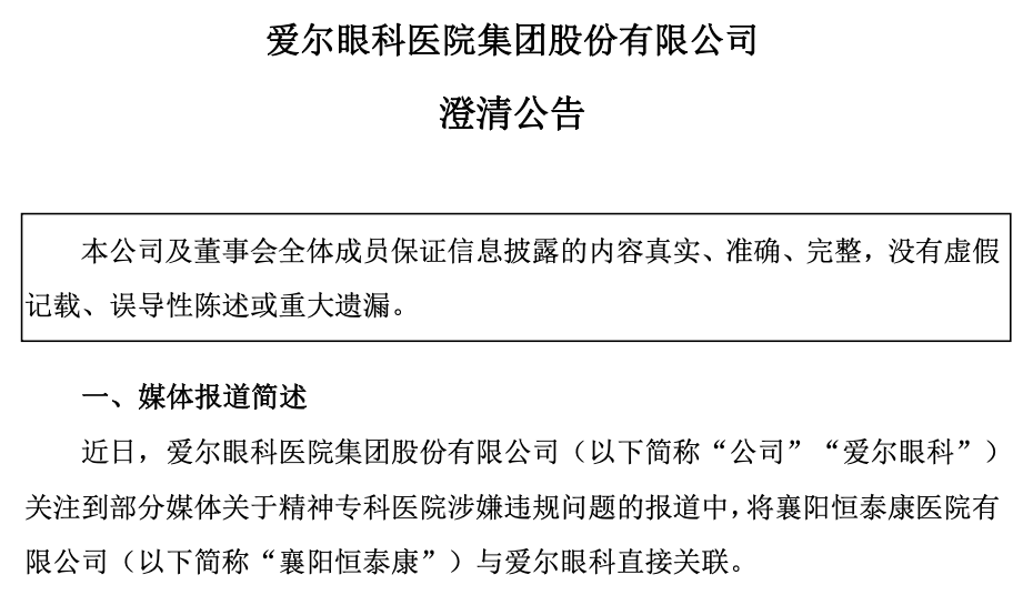 爱尔眼科公告回应“精神病医院骗保”事件。